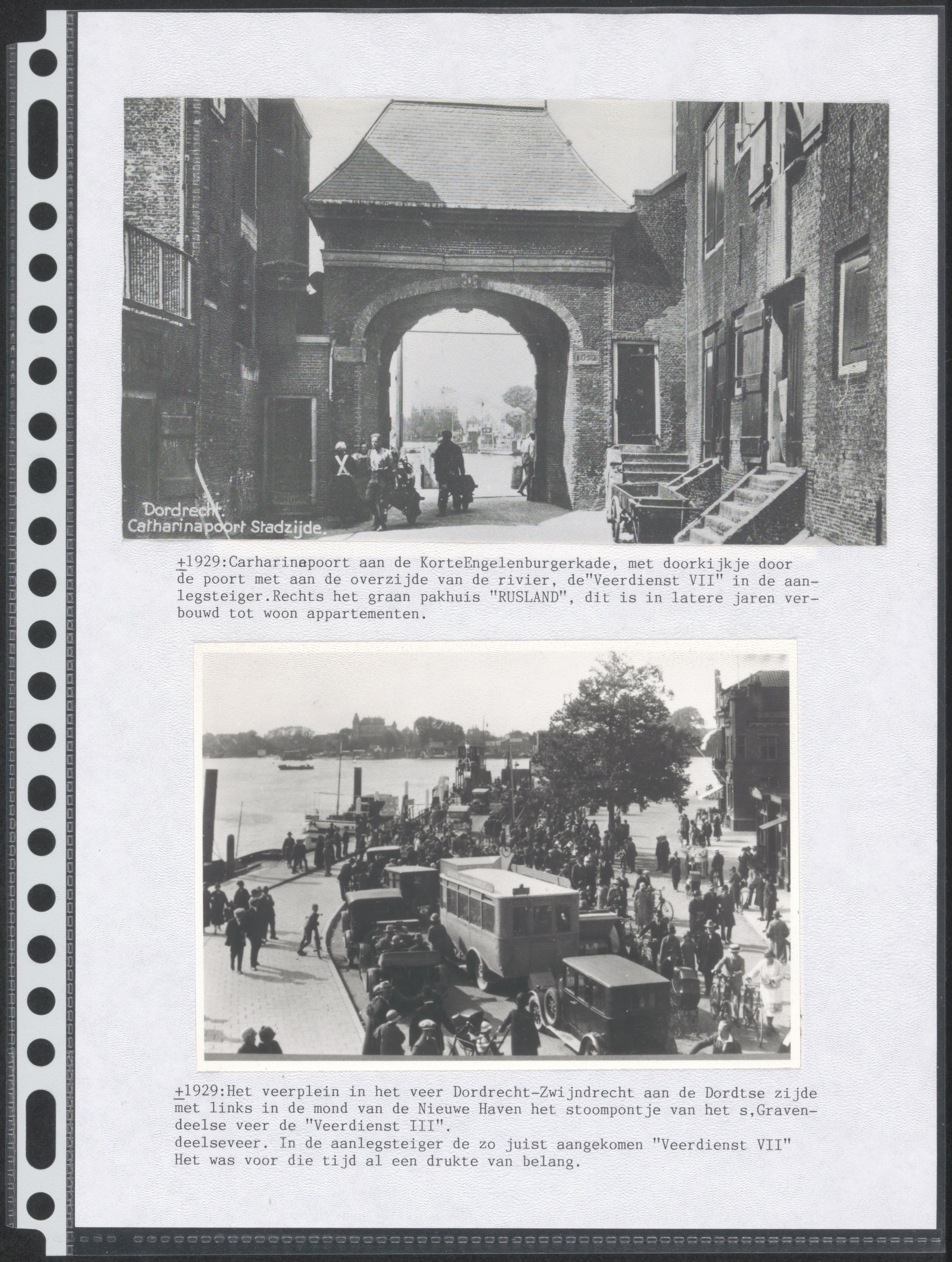 - Boven: De Catrijnepoort met zicht op de aanlegplaats van Veerdienst VII in Zwijndrecht. Rechts pakhuis Rusland aan de Korte Engelenburgerkade. Onder: Het Zwijndrechts veer met Veedienst VII op de aanlegplaats. Links ligt de Veerdienst III van het veer op 's-Gravendeel.