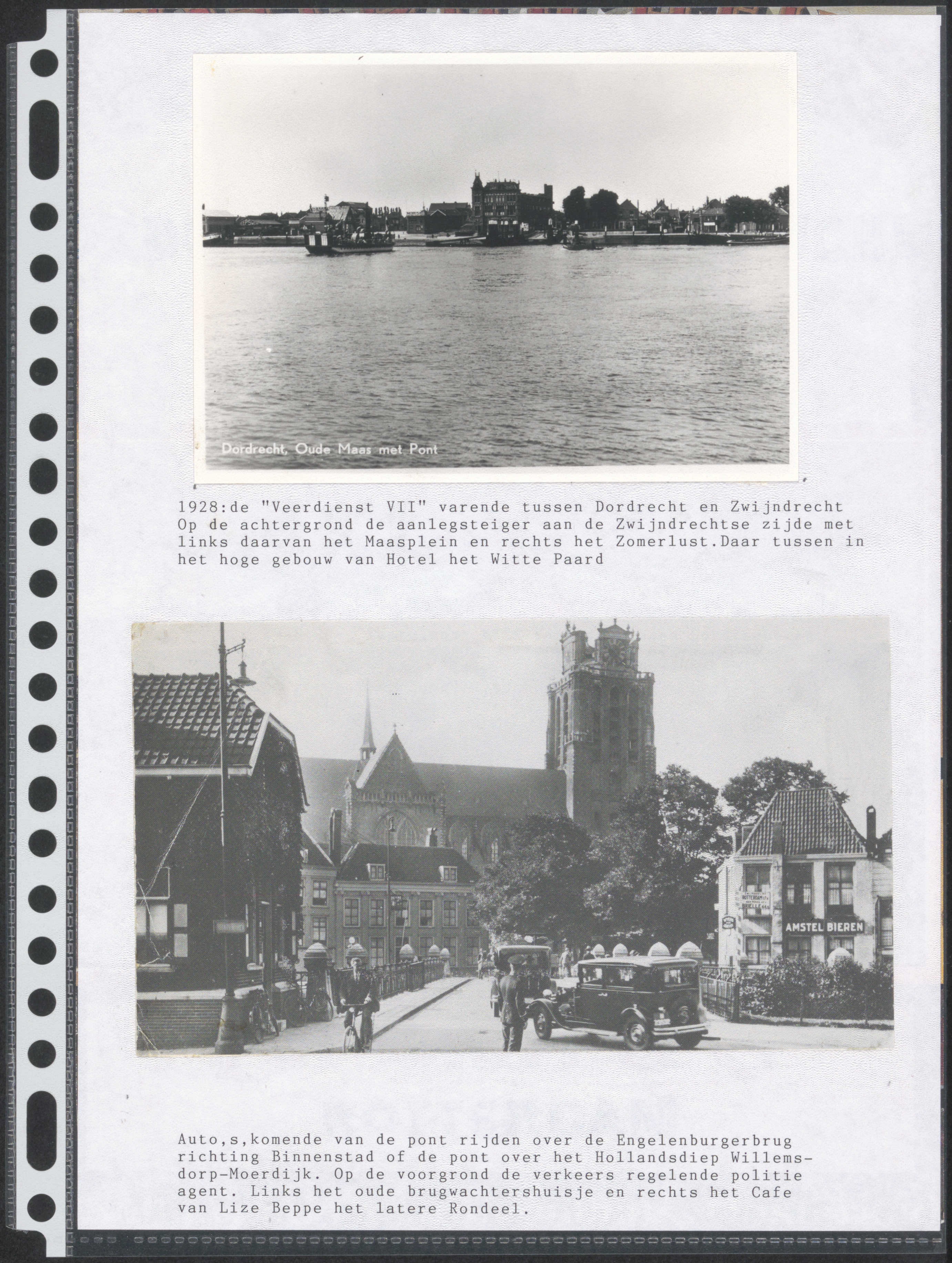 - Boven: De Veerdienst VII op de Oude Maas ter hoogte van hotel Het Witte Paard aan het Veerplein in Zwijndrecht. Onder: Engelenburgerbrug in de richting van de Houttuinen en de Grote Kerk.