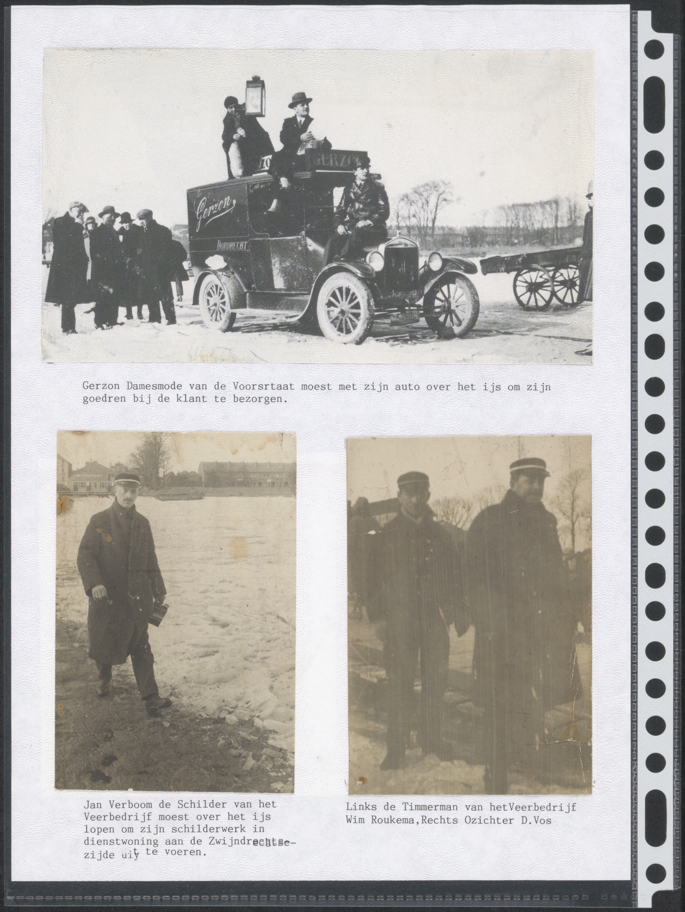 - Boven: Bestelauto van damesmode Gerzon op de dichtgevroren Oude Maas. Onder: Medewerkers van het veerbedrijf. Links schilder Jan Verboom, rechts timmerman Wim Roukema en opzichter D. Vos.