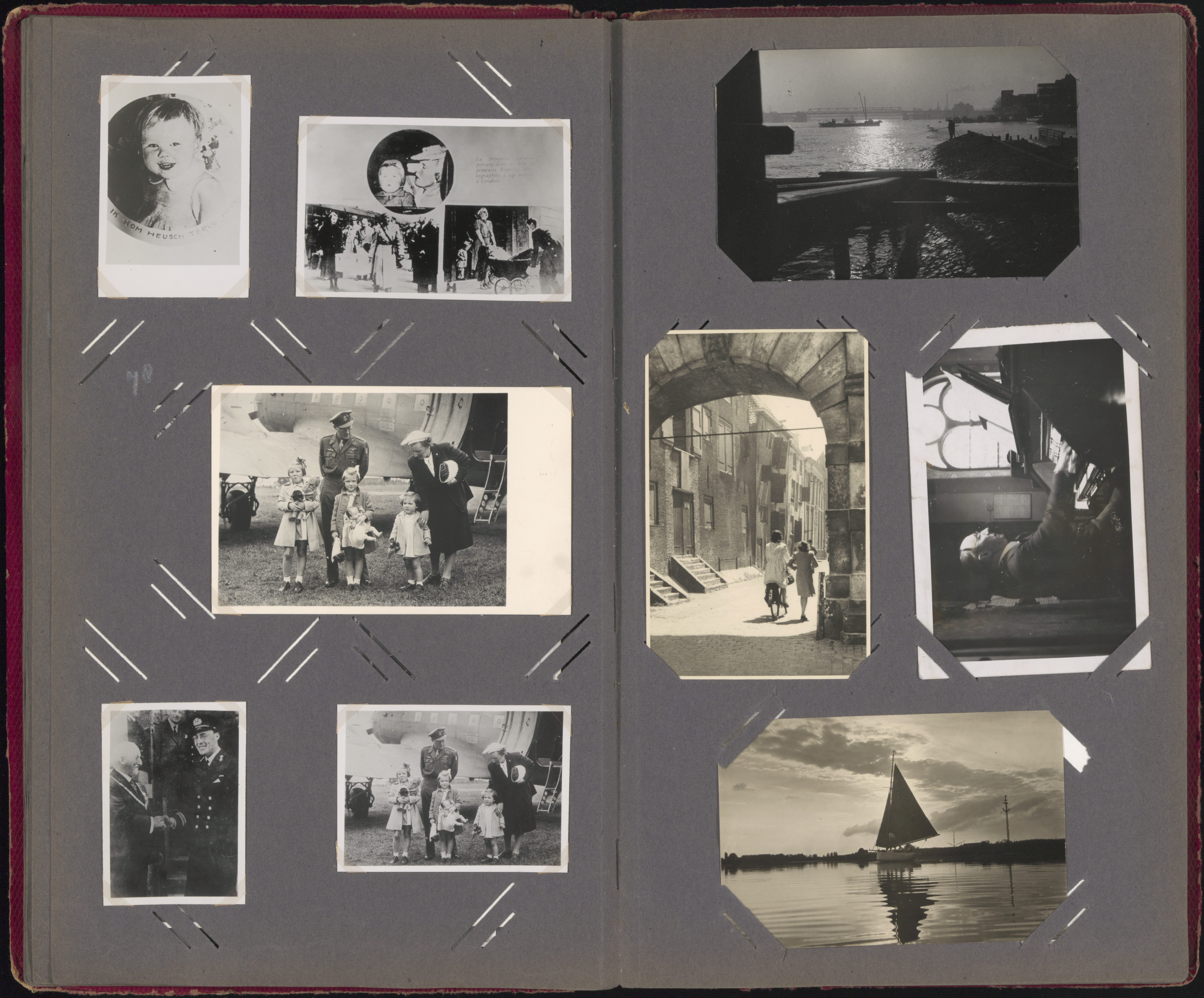 [fotoalbum Piet Kuiters] terugkeer Koningin Juliana, prins Bernhard, met de drie dochters (vliegtuig, zeilschip)
