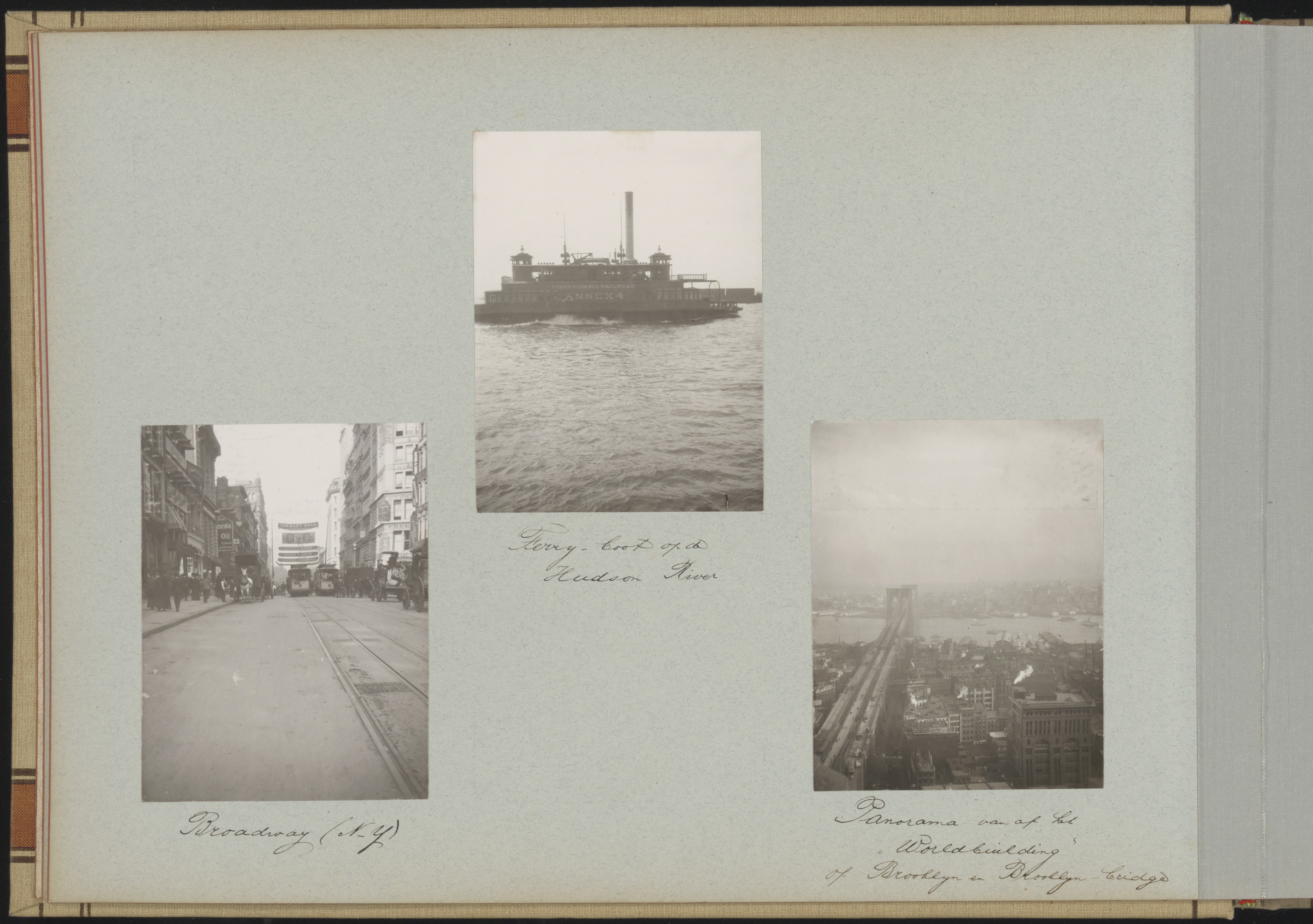 Midden: De veerboot Annex 4, is een zogenaamde 'sidewheeler', wat wilt zeggen dat de schoepenraderen zich aan de buitenzijden van deze stoompont bevinden. De veerboot werd in 1890 gebouwd op de scheepswerf van de Jackson & Sharp Company te Wilmington, Delaware en had 425 pk tot zijn beschikking. Rechts: De Brooklyn Bridge gezien vanaf "World" building, New York.