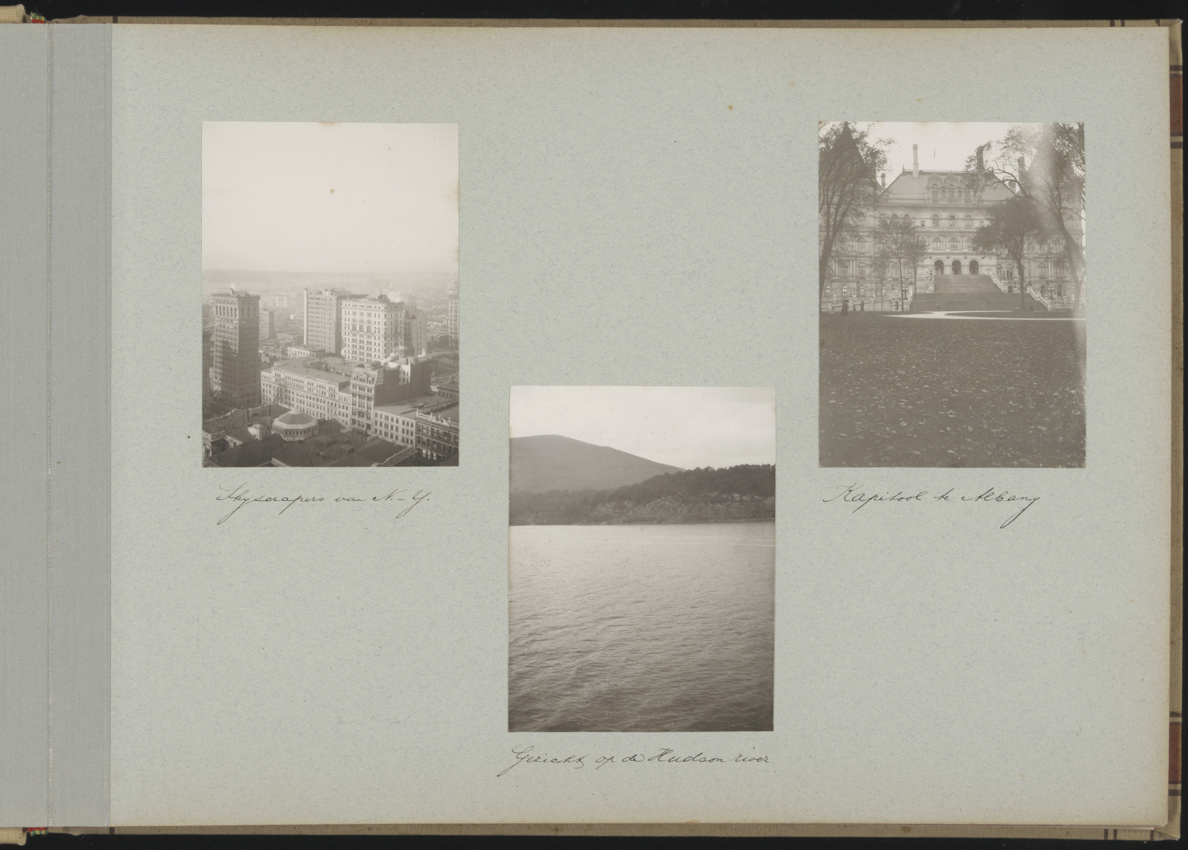 Rechts: New York State Capitol, Albany, New York met helemaal op de voorgrond het Tweed Courthouse. Midden: Gezicht op de Hudson rivier. Rechts: New York State Capitol, Albany, NewYork.