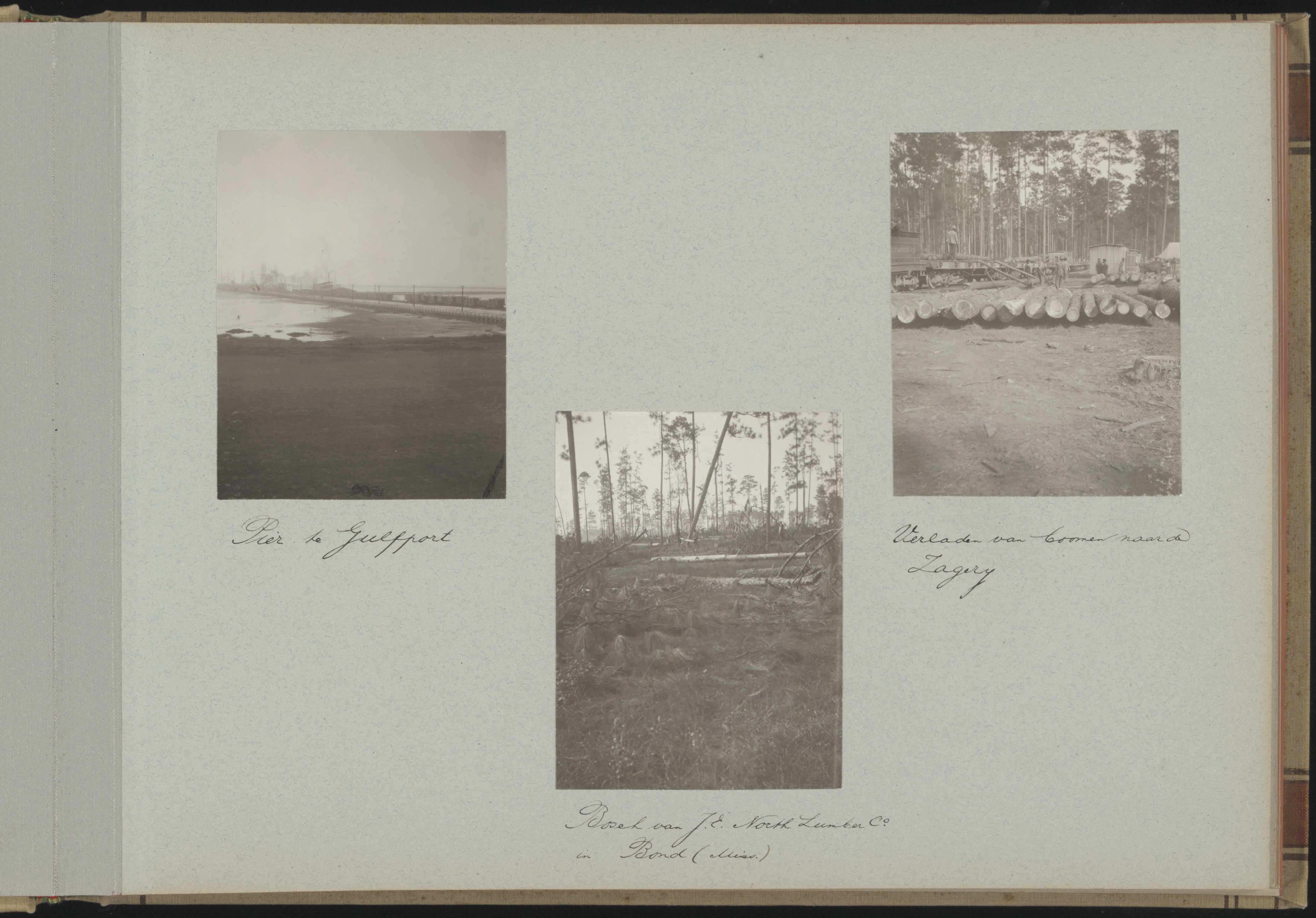 Midden: Bos van de "J.E. North Lumber Company" te Bond, Mississippi. Rechts: De omgehaalde bomen werden met behulp van paarden naar de locaties gesleept waar ze op een goederentrein van de fabriek zelf naar de zagerij werden vervoerd.