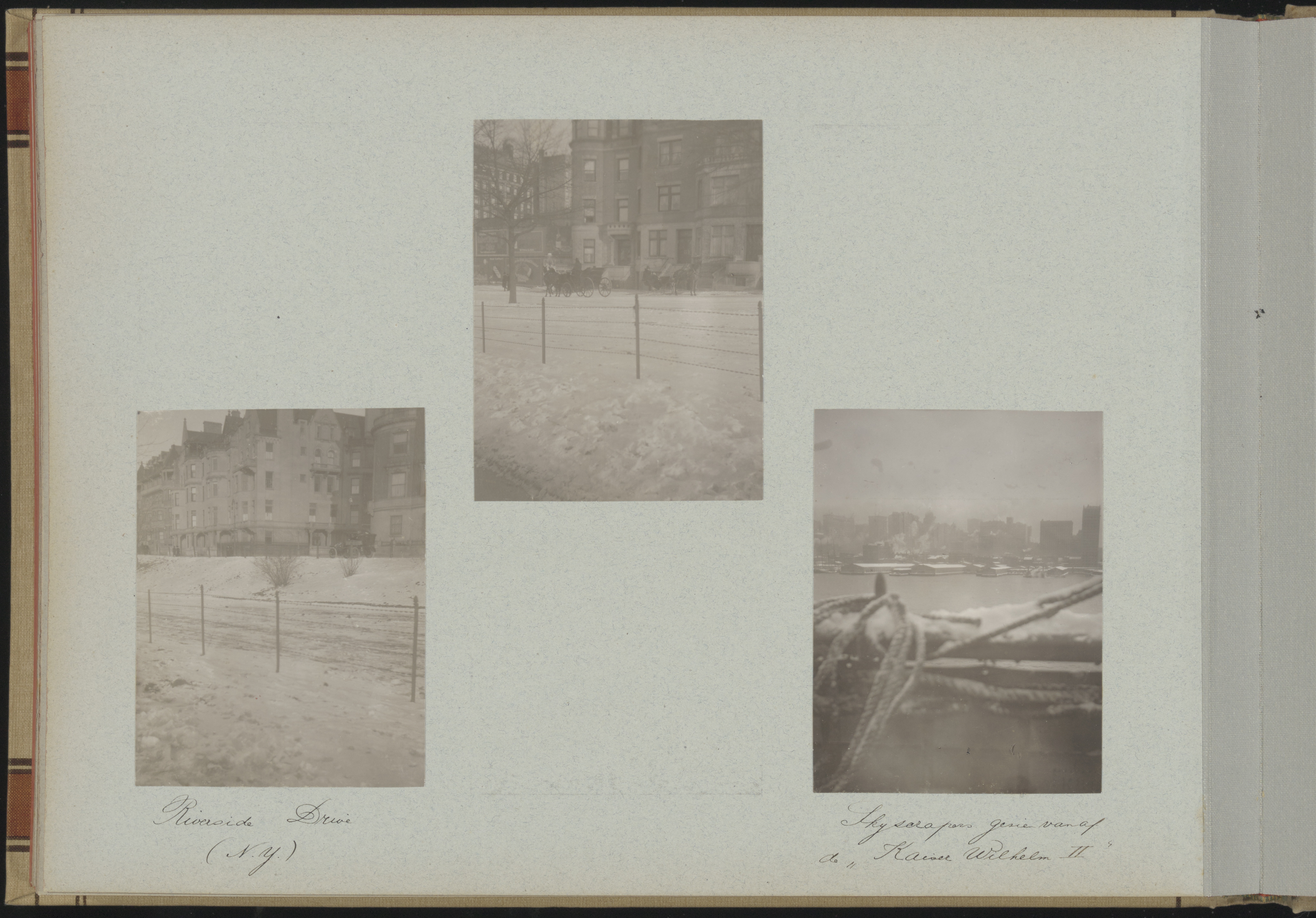 Rechts: Een gedeelte van de New York skyline anno 1904-1905, gezien vanaf de de SS "Kaiser Wilhelm II", een in april 1903 bij AG Vulcan, Stettin, Duitsland gereedgekomen passagiersschip van de Norddeutscher Lloyd varende op de lijn Duitsland (Hamburg)–New York.
