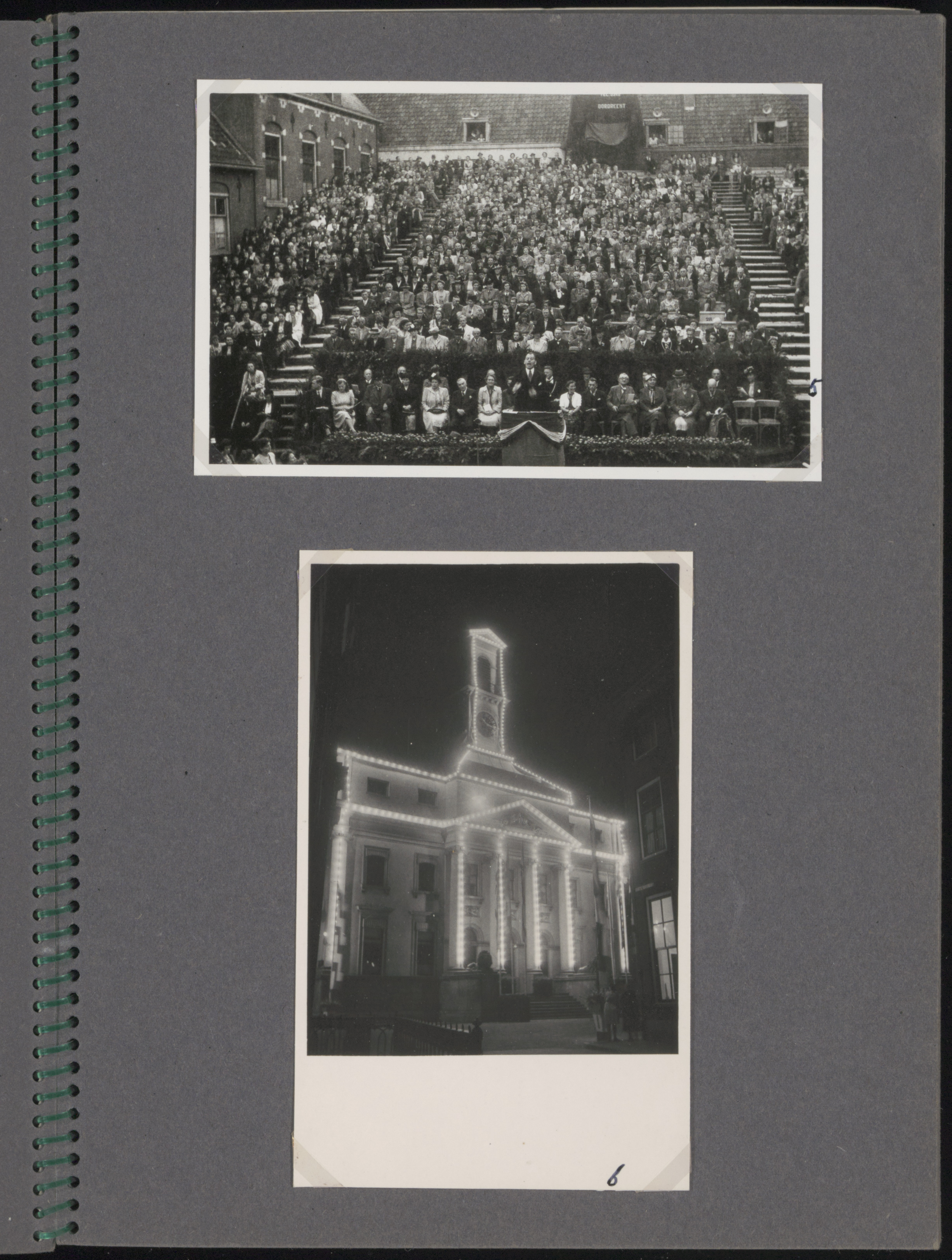 - Boven: Publiek bij de zanguitvoering in het Hof tijdens de Hoffeesten van t.g.v. de 375e herdenking van de Eerste Vrije Statenverkiezing in 1572. Onder: Stadhuis in feestverlichting.