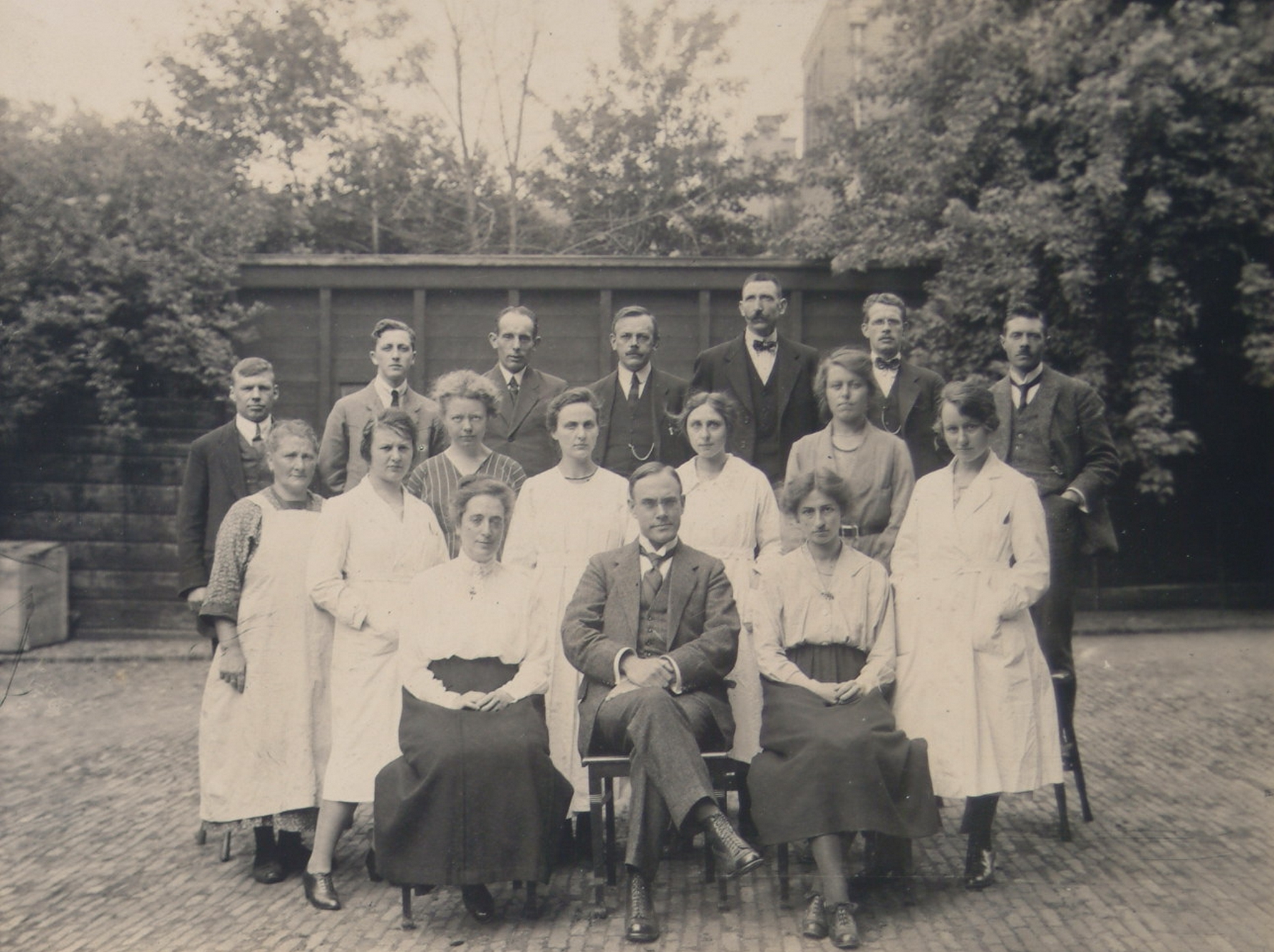 - Personeel van de Keuringsdienst van Waren in de tuin van Nieuwstraat V.l.n.r. voorste rij: Ir. E. van West (onderdirectrice), Dr. G.J.van Meurs (directeur), N.Kloppert (scheikundige). 2e: mevr. Hennekes (werkster), B.G.Romijn (analiste), Tj.Wip (boekhoudster), A.M.C.Bohnen (analiste), M.E.J. de Graaf, C. van Barneveld en M.W.Keeman (alle drie leerling-analiste). 3e rij: J. Krans (lab. bediende), M.W. van Zijderveld (bureaubeambte), H. van den Berg (keurmeester), F.L. Steenwinkel (keurmeester), A.Bezemer (hoofdkeurmeester), A.Brand (keurmeester), N.J.Medemblik (keurmeester).