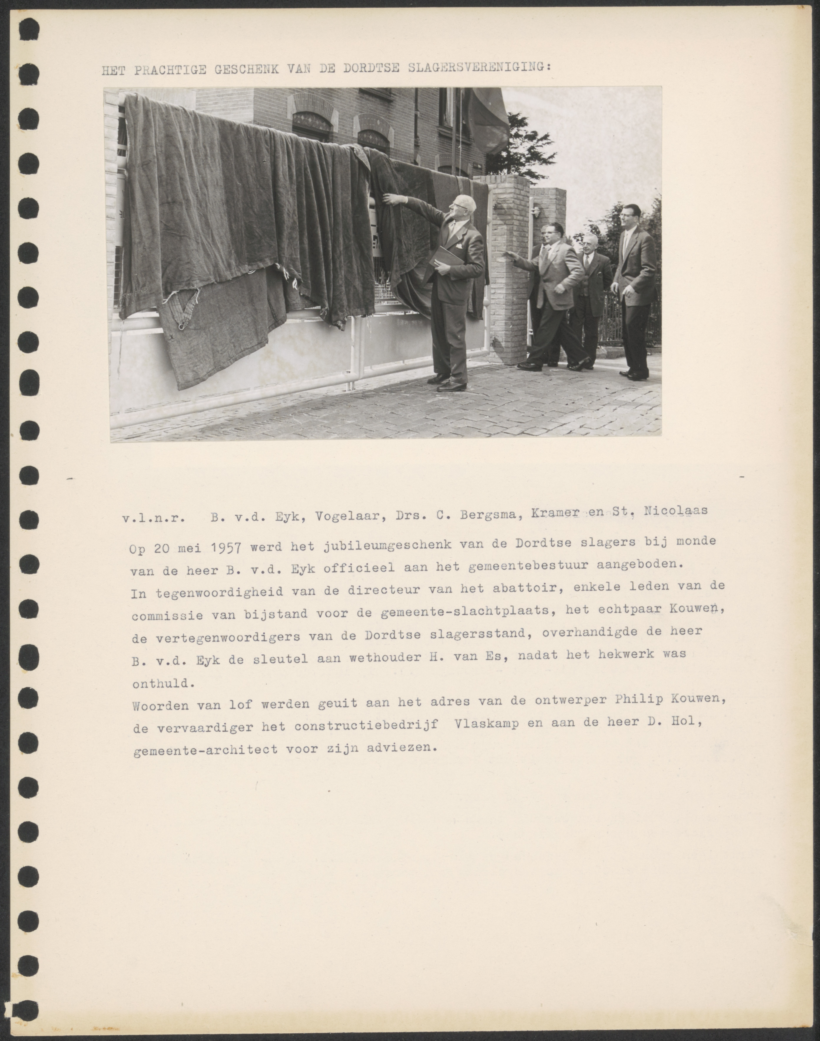 - Onthulling van het door de Dordtse Slagersvereniging aangeboden toegangshek van het slachthuis aan de Markettenweg. V.l.n.r. B. v.d. Eyk, Vogelaar, C. Bergsma, Kramer en St. Nicolaas.