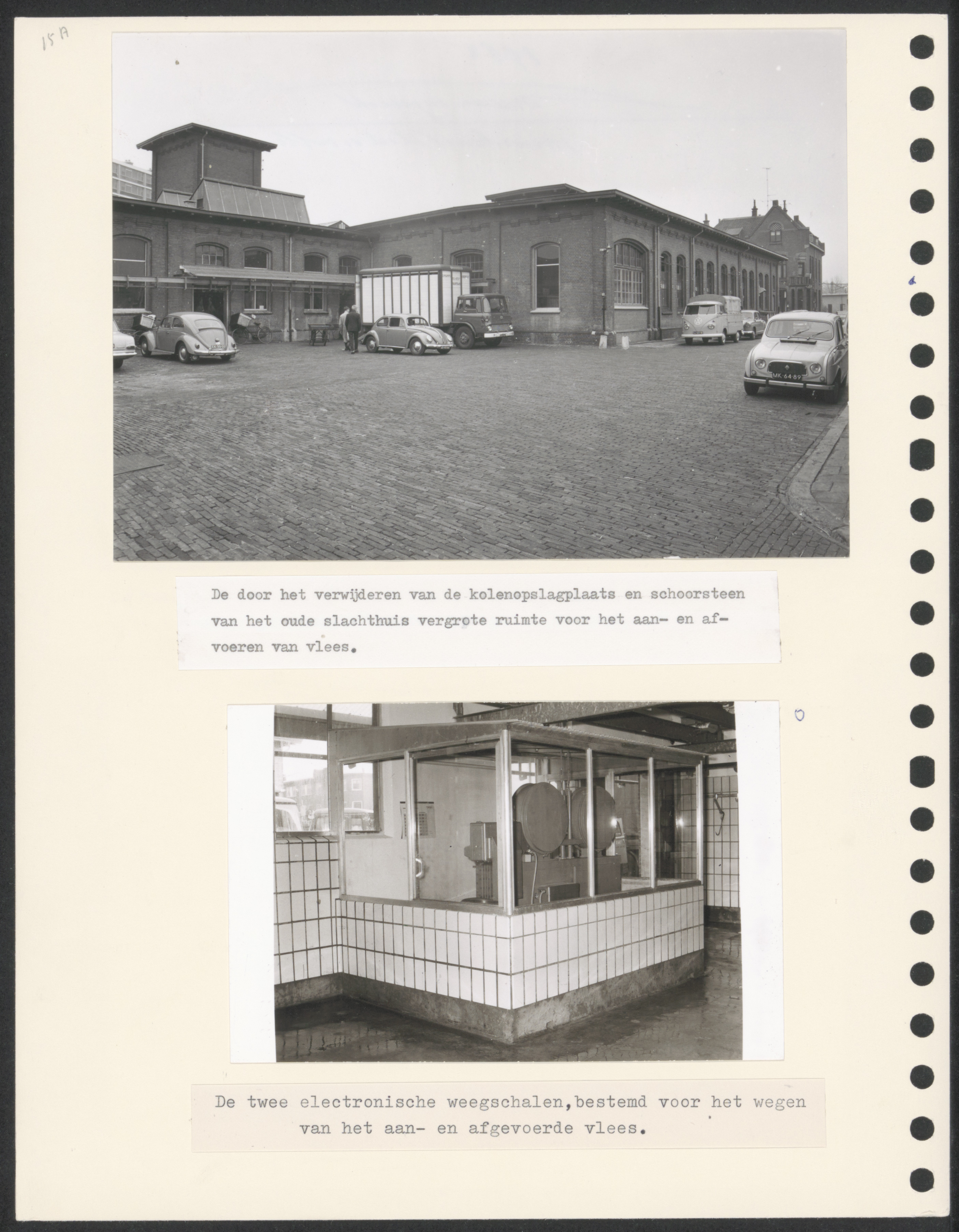 - Boven: Aan- en afvoer van vlees bij het slachthuis. Onder: Weegschalen in het slachthuis aan de Markettenweg.
