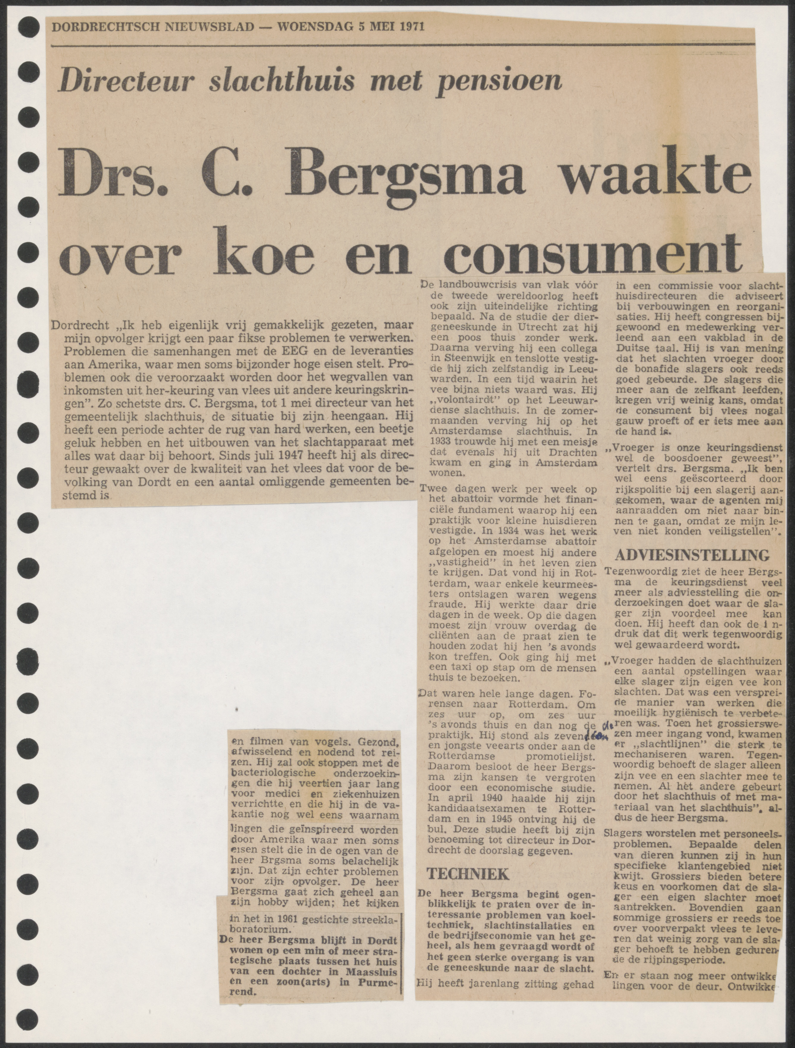 - Krantenartikel over de pensionering van directeur Bergsma van het slachthuis aan de Markettenweg.