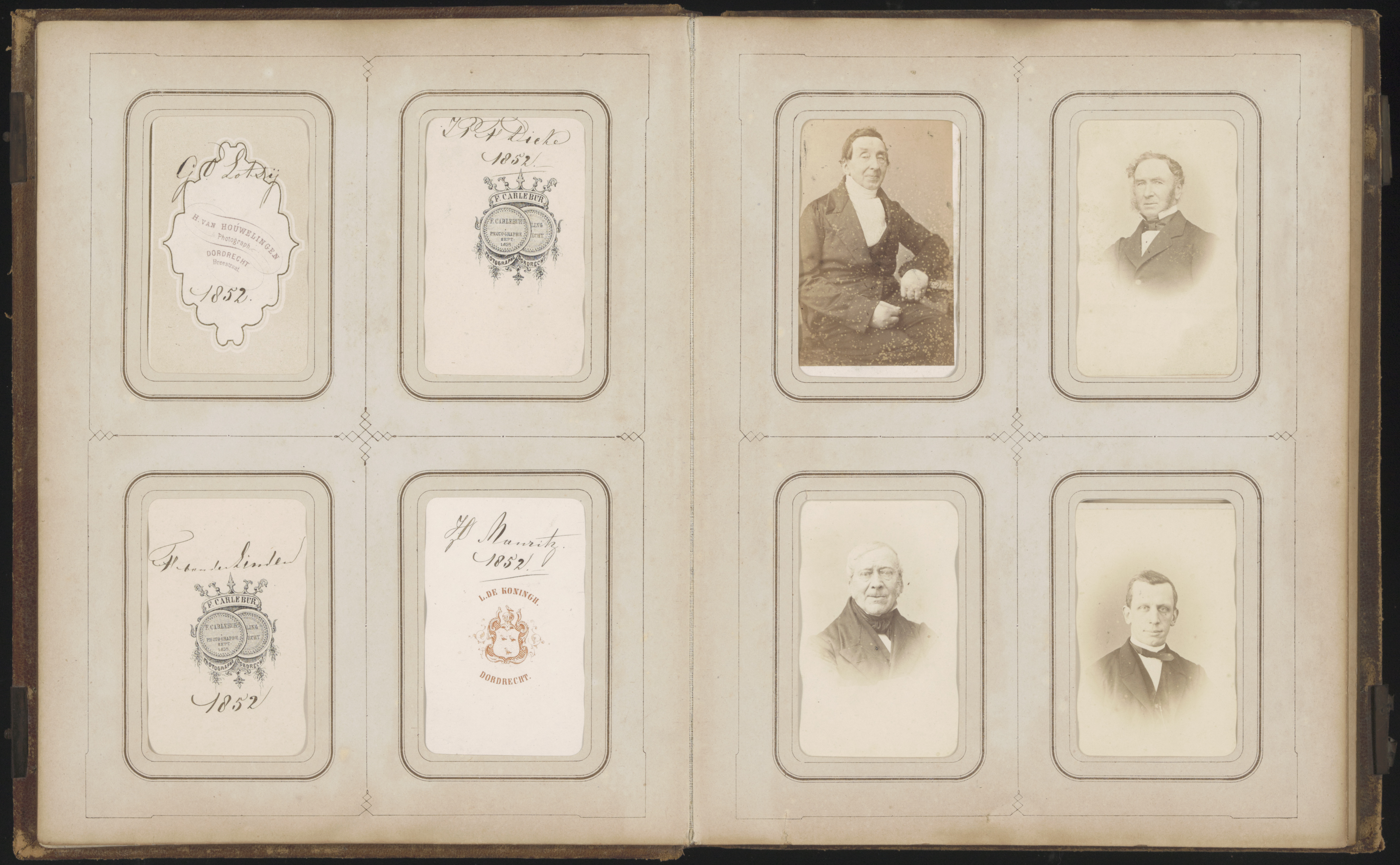 - Bestuursleden van de Dordrechtsche Hulpbank. Linksboven: ds. Fredrik Michelsen (overleden 1870, 76 jaar oud). Rechtsboven: Hendrik Johan Knottenbelt (overleden 1884, 77 jaar oud). Linksonder: Cornelis Longépée (1790-1872). Rechtsonder: mr. Hermanus Adrianus Nebbens Sterling (1828-1908, o.a. burgemeester van Dordrecht).