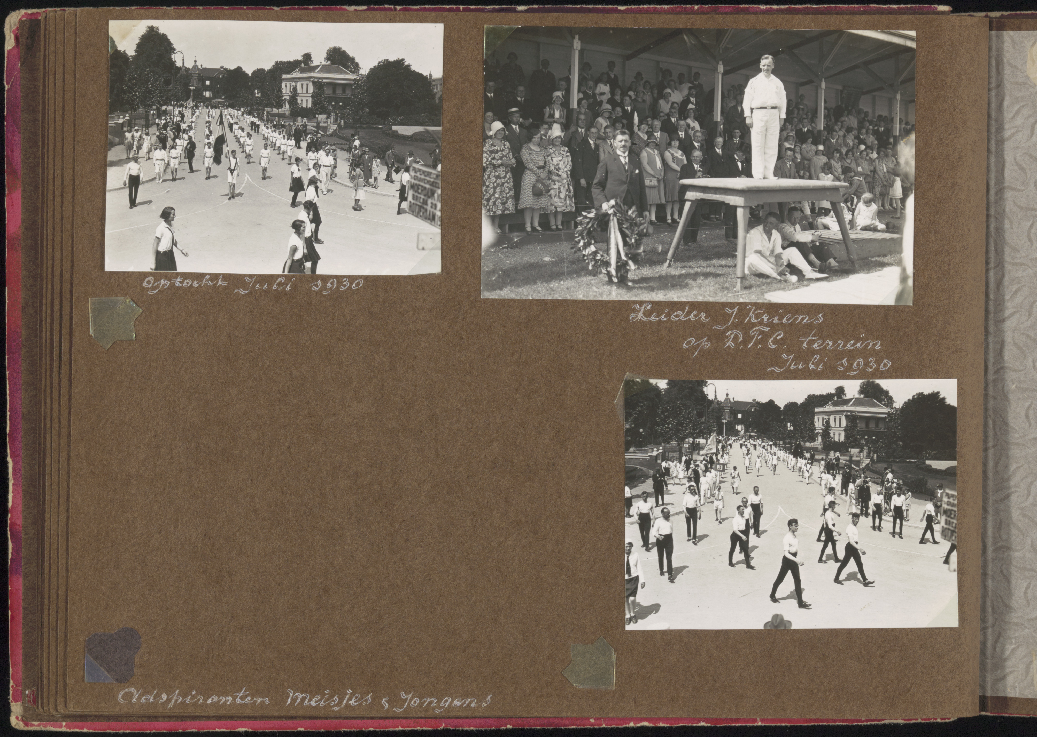- Linksboven en rechtsonder: Optocht met gymnastiekvereniging OKK op de Stationsweg. Rechtsboven: Toespraak door voorzitter J. Kriens op het DFC-terrein aan de Markettenweg. Bijschrift van afwezige foto: Adspiranten meisjes & Jongens.