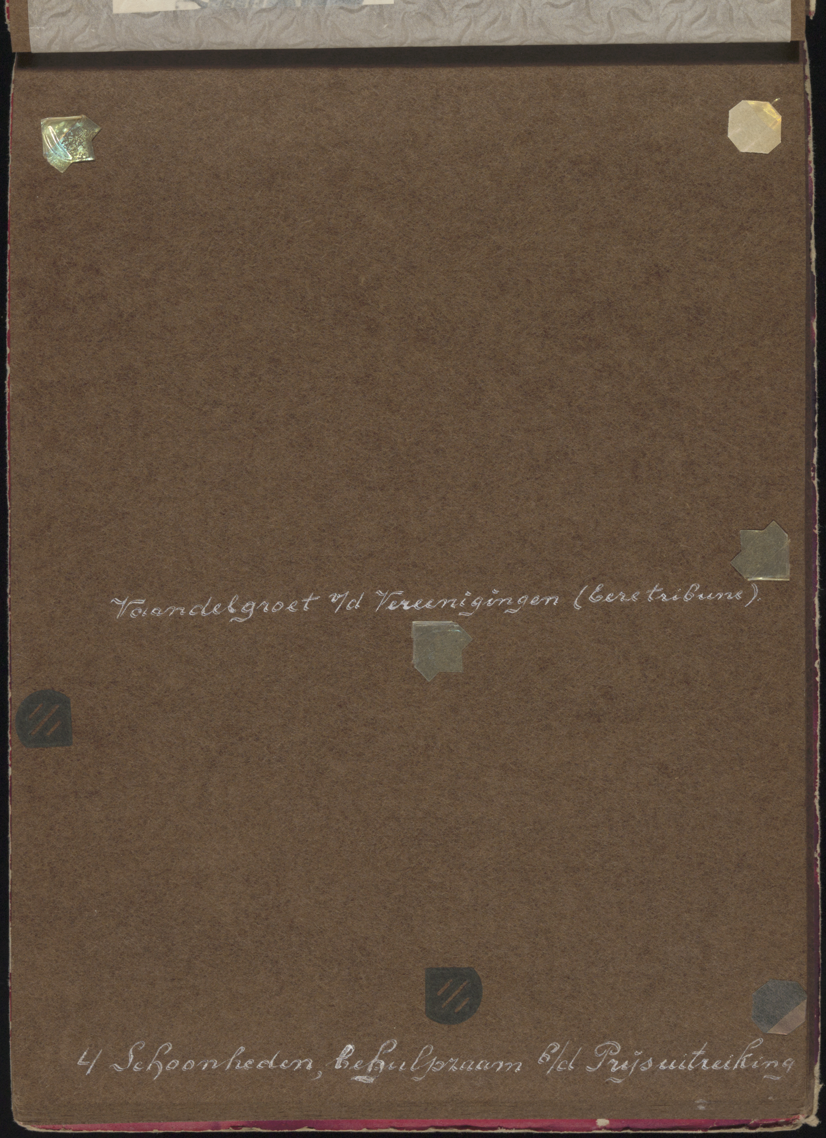- Bladzij zonder foto's in album van gymnastiekvereniging OKK. Bijschrift 1:Vaandelgroet v/d verenigingen b/d eretribune. Bijschrift 2: 4 schoonheden, behulpzaam b/d prijsuitreiking.