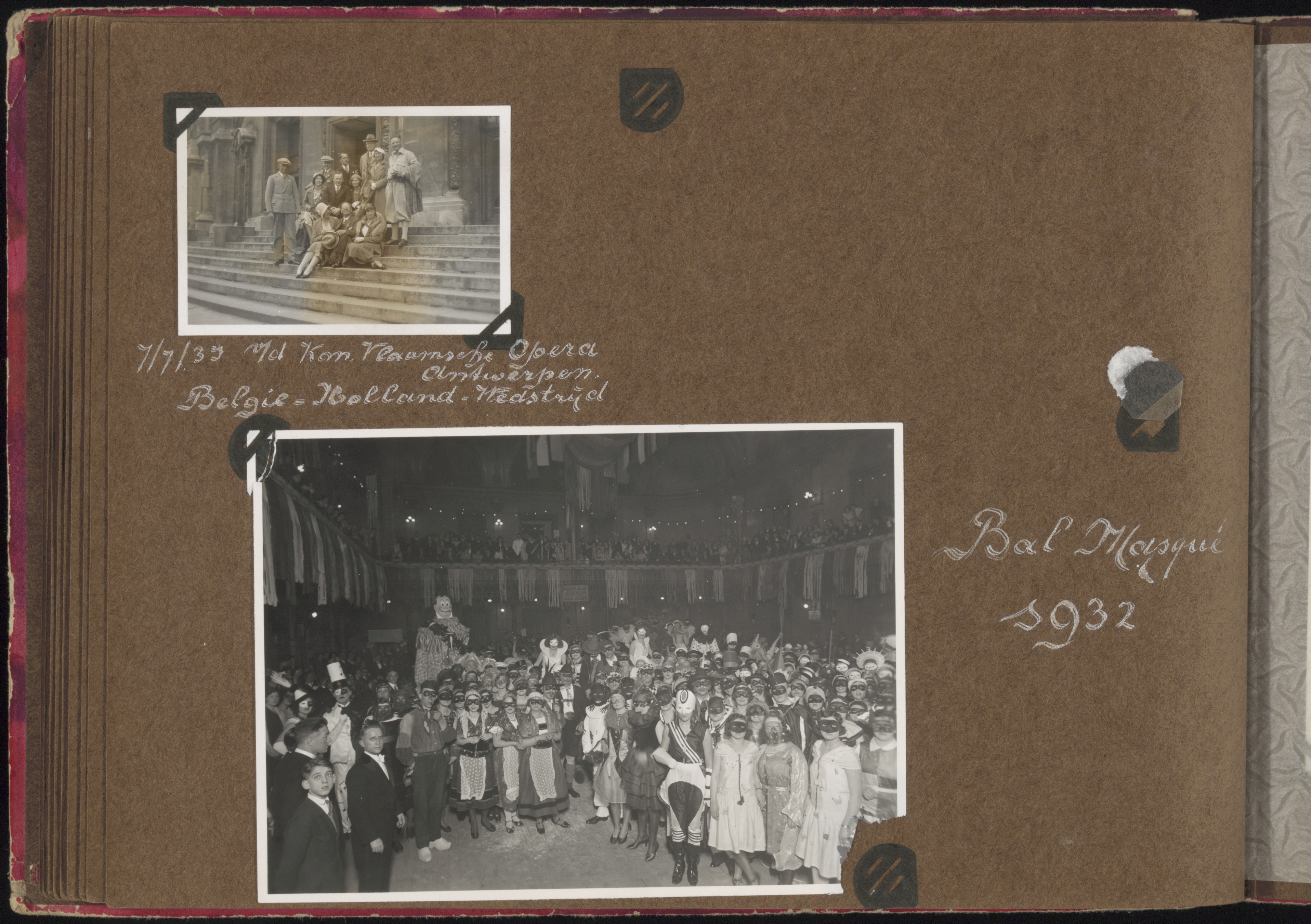 - Boven: Leden van gymnastiekvereniging OKK tijdens de landenwedstrijd Holland-België voor het gebouw van de Vlaamse Opera in Antwerpen. Onder: Bal masqué.