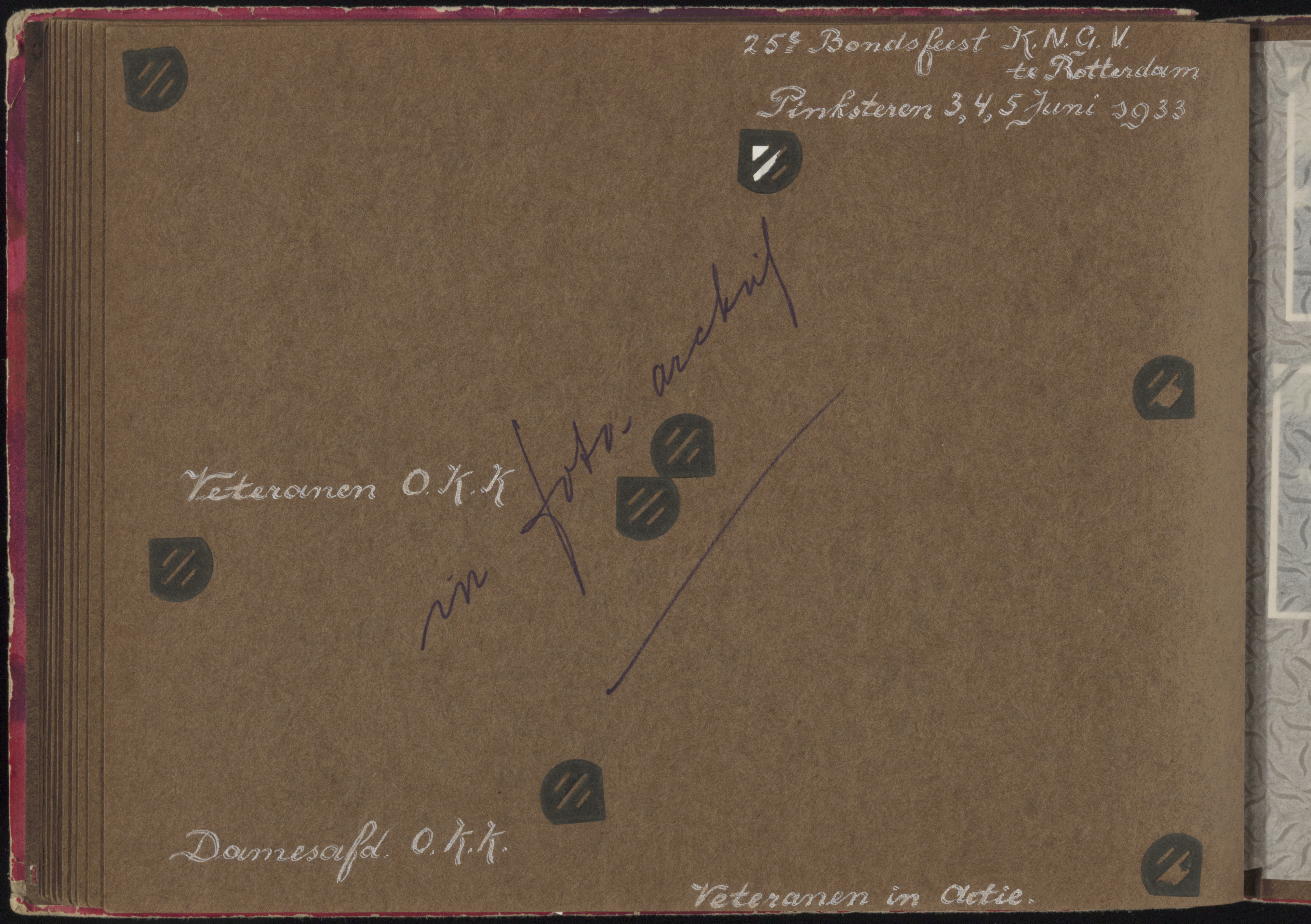 - Bladzij zonder foto's in album van gymnastiekvereniging OKK. Bijschrift 1 en 4: Veteranen. Bijschrift 2: Damesafdeling. Bijschrift 3: 25e Bondsfeest KNGV te Rotterdam.