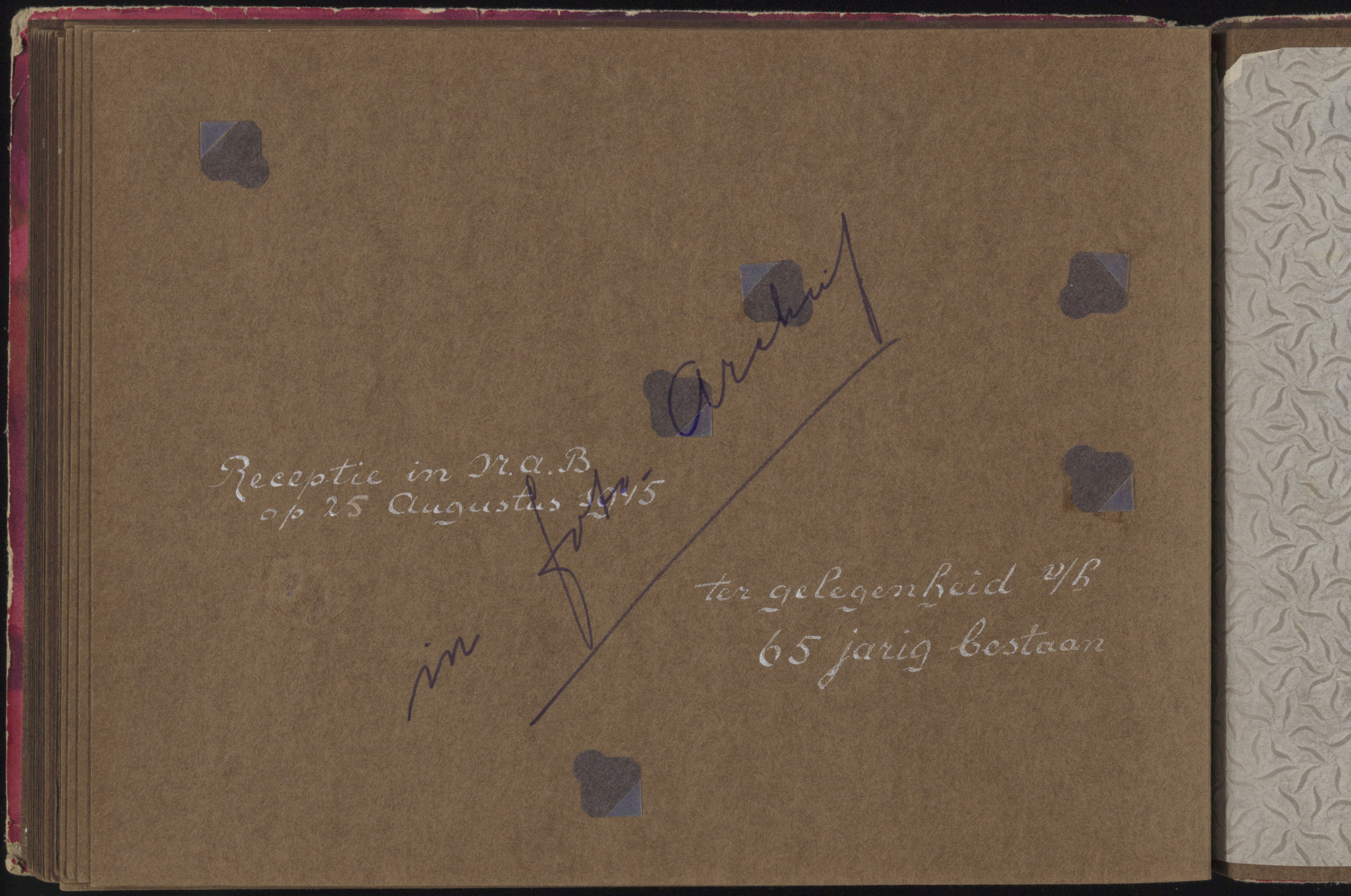 - Bladzij zonder foto's in album van gymnastiekvereniging OKK. Bijschrift: Receptie in NAB op 25 augustus 1945 t.g.v. het 65-jarig bestaan.