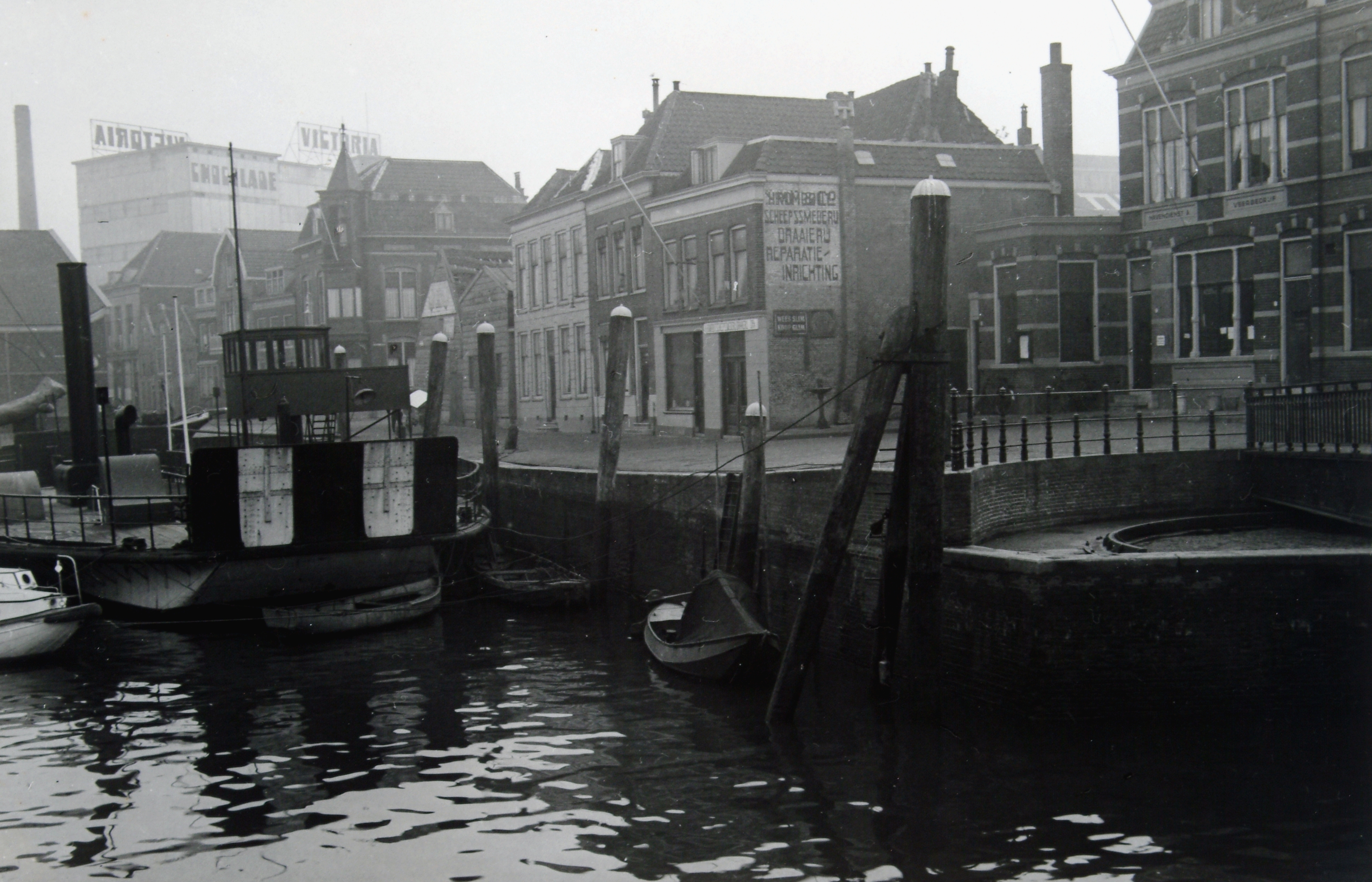 - Draai van de Binnen Kalkhaven gezien. Uiterst rechts de Draaibrug, links de biscuit- en chocoladefabriek Victoria. In de Kalkhaven ligt een veerboot.