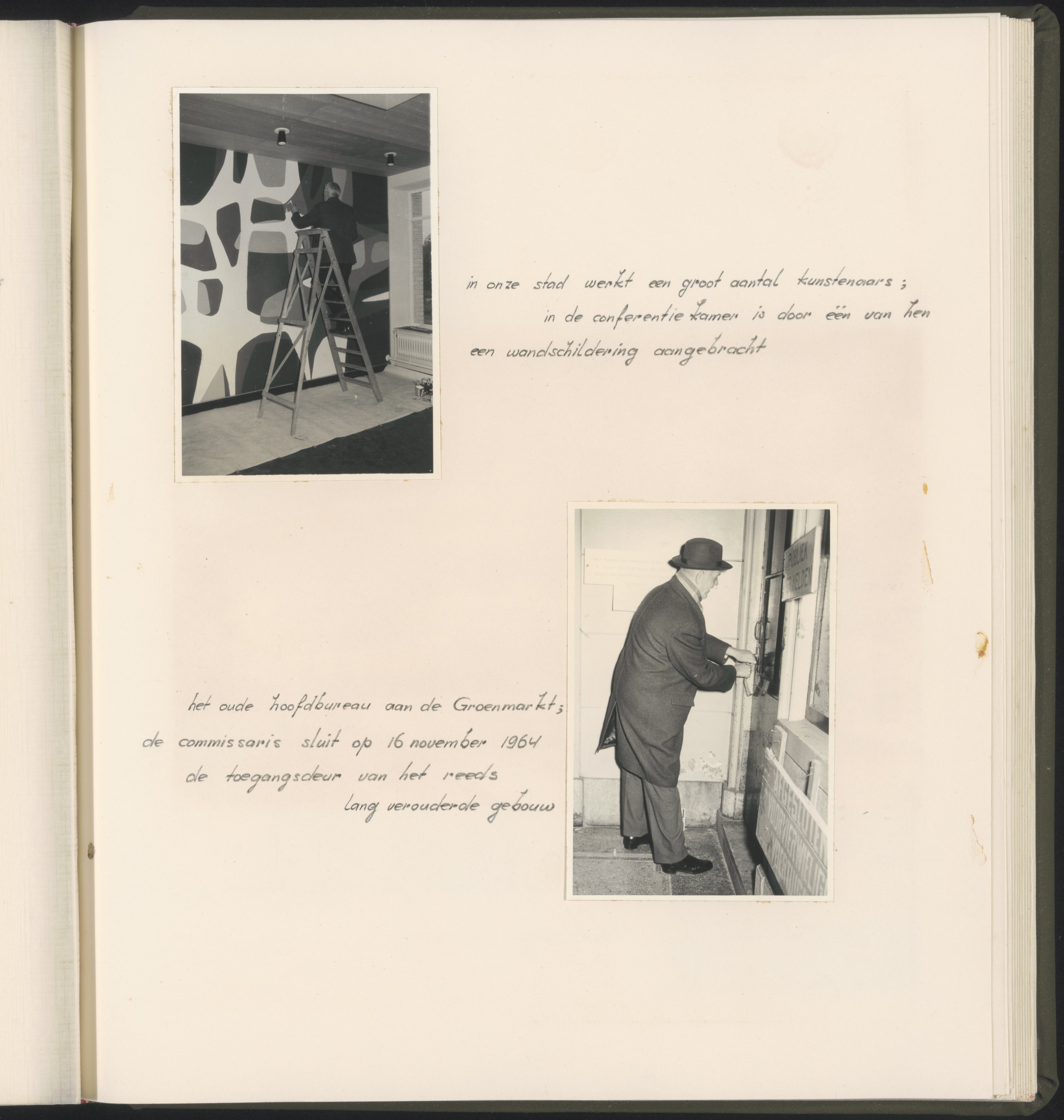 Boven: Aanbrengen van een wandschildering door een Dordts kunstenaar in de vergaderzaal van het bijna voltooide politiebureau op de hoek Nassauweg/Mauritsweg. Onder: De commissaris van politie sluit voor de laatste maal het oude hoofdbureau aan de Groenmarkt.