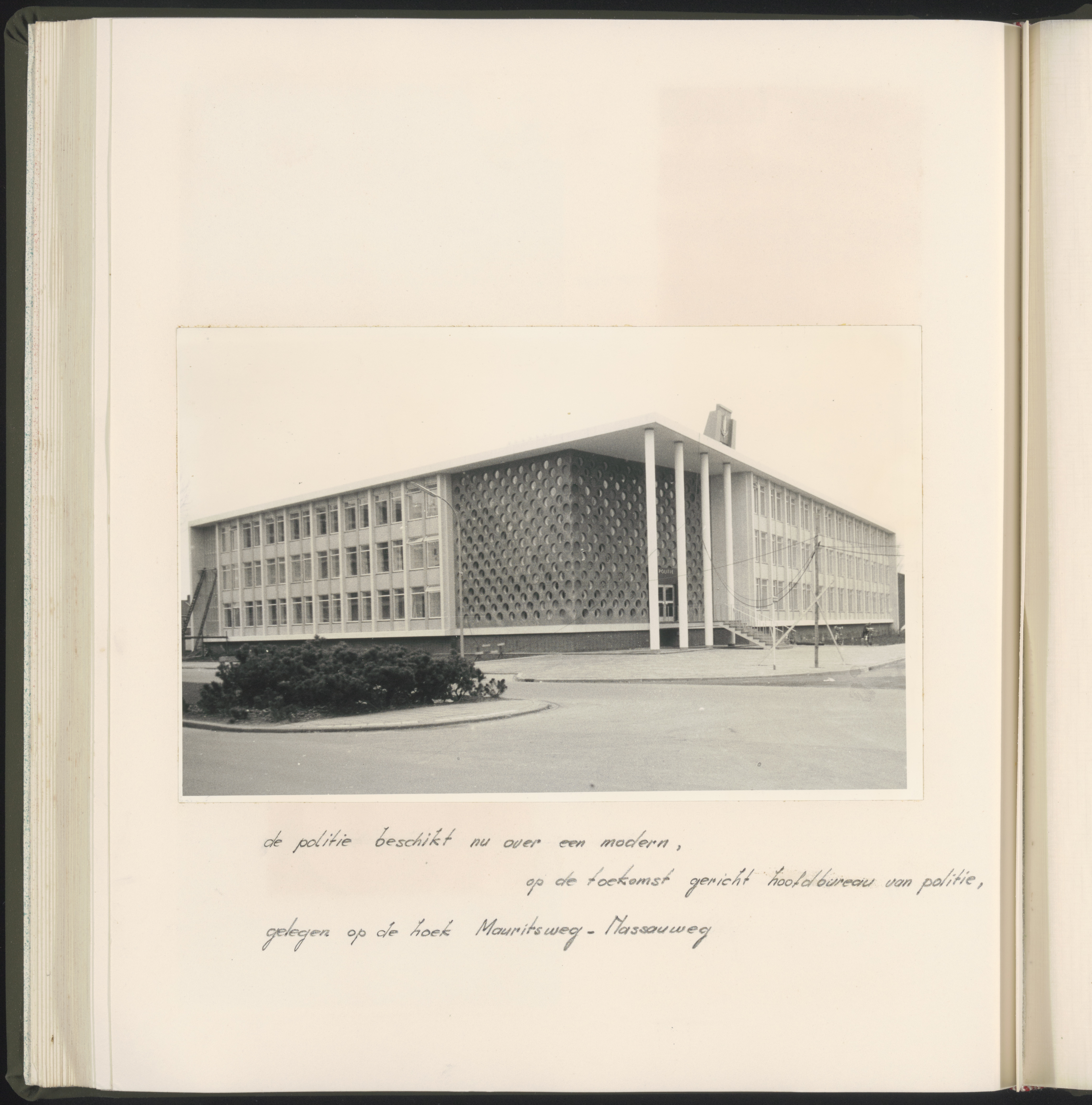 - Het nieuw gebouwde hoofdbureau van politie op de hoek Nassauweg/Mauritsweg (voorgrond).