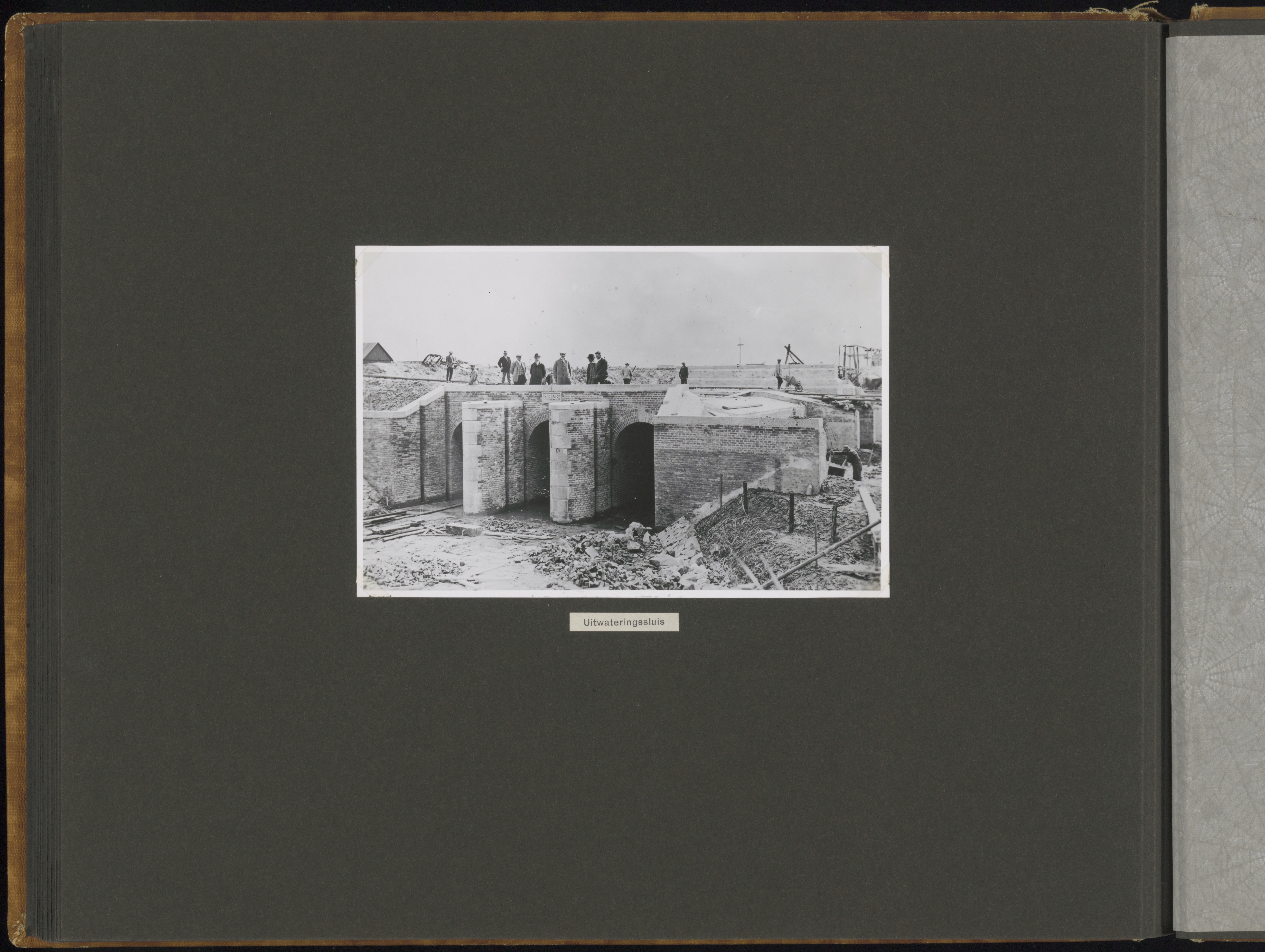 Bouw van de uitwateringssluis in de Zuidwestdijk.