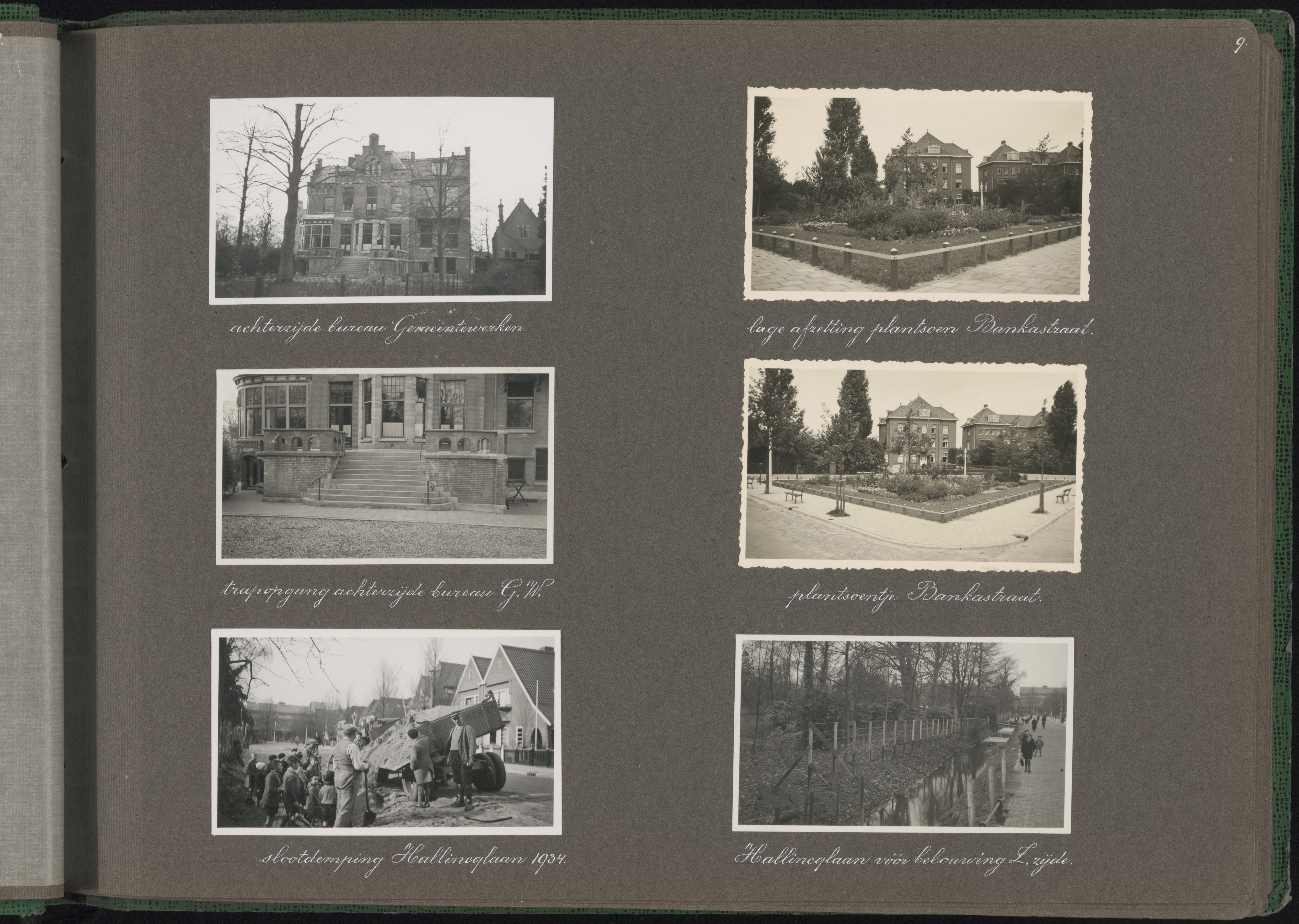 - Achterkant van bureau Gemeentewerken aan de Godfried Schalckensingel, plantsoen in de Bankastraat voor de Ziekenverpleging en de Hallincqlaan.