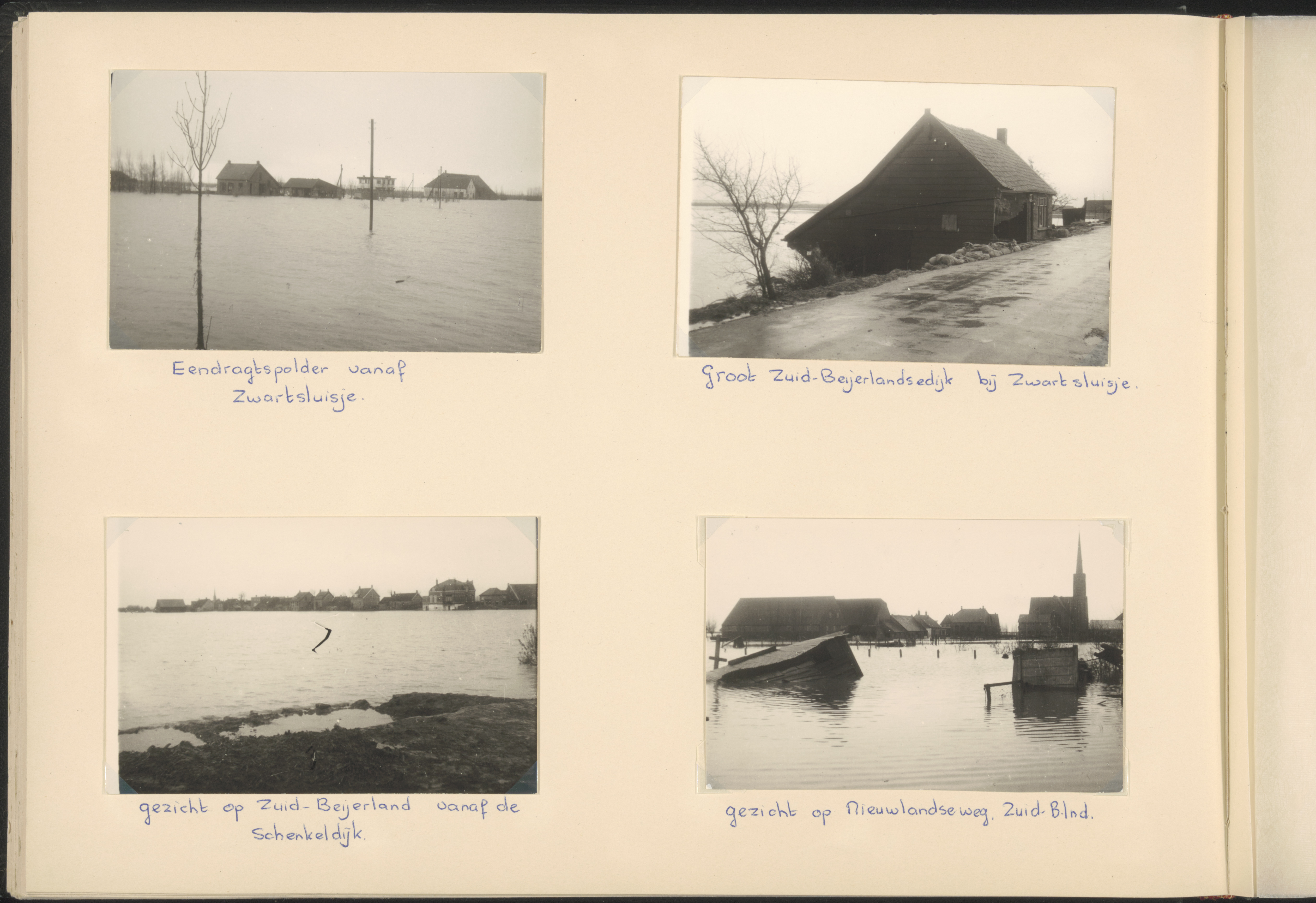 - Watersnood in Zuid-Beijerland. Linksboven: De Eendragtspolder gezien vanaf Zwartsluisje. Rechtsboven: Groot Zuid-Beijerlandsedijk bij Zwartsluisje. Linksonder: Zicht op Zuid-Beijerland vanaf de Schenkeldijk. Rechtsonder: De Nieuwlandseweg en de Eendrachtskerk aan de Koninginneweg.