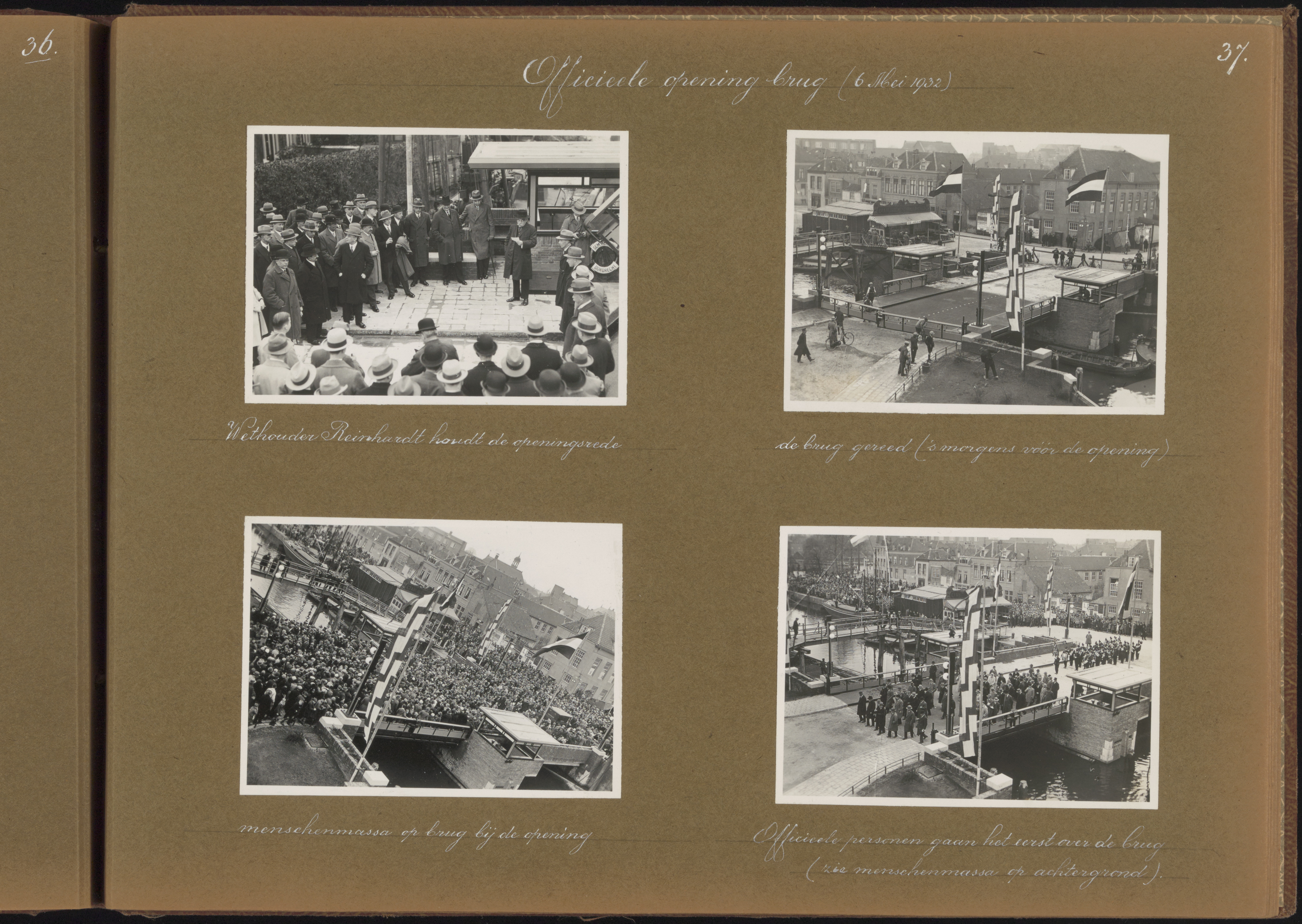 - bruggen bruggenbouw brugwachtershuisjes havens openingen poffertjeskramen / poffertjessalons publiek / toeschouwers renovaties vlaggen(stokken) voetgangersbruggen wethouders