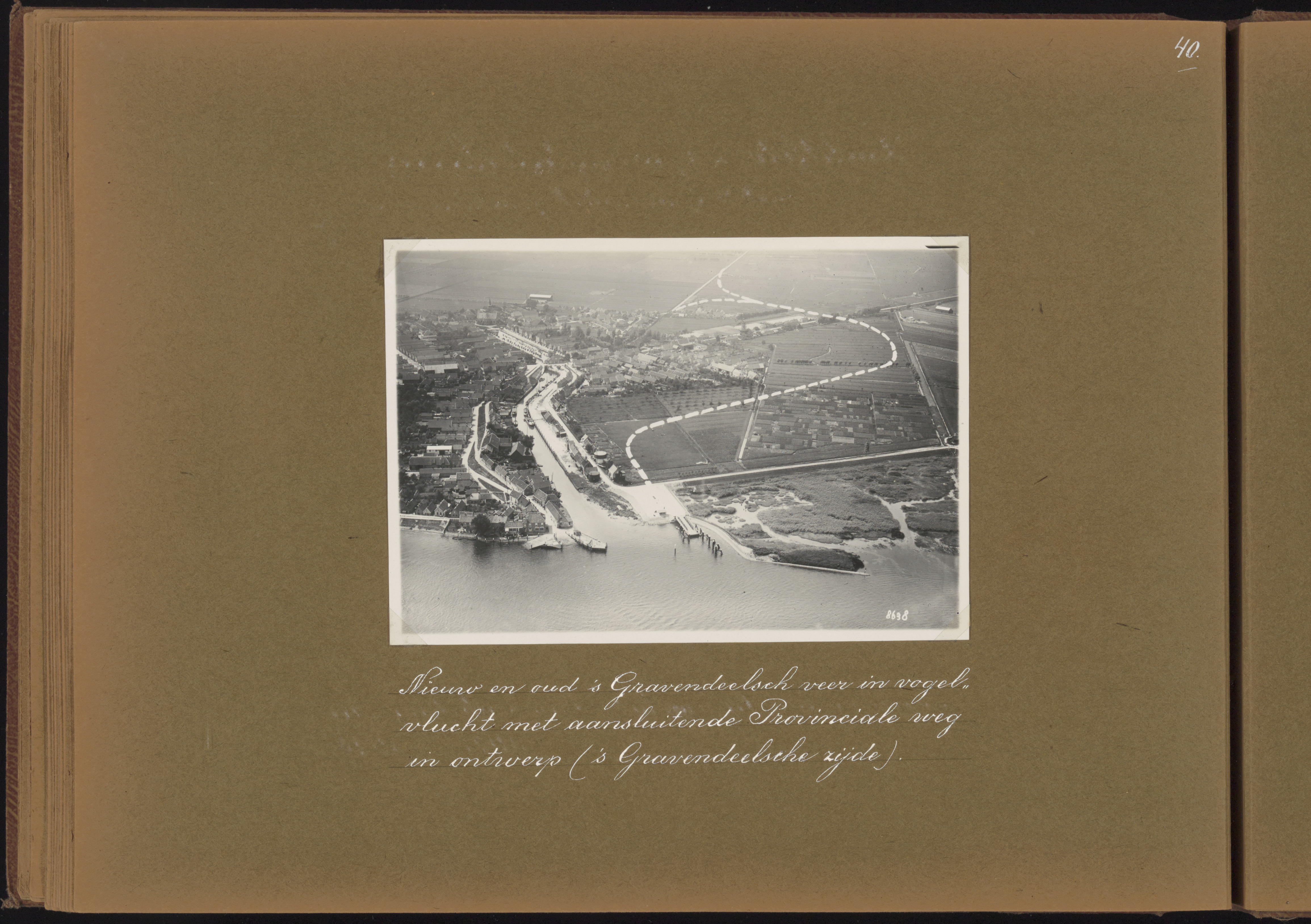 - Luchtfoto van de oude en de nieuwe veersteiger in s'-Gravendeel en een ontwerp voor de nieuwe Provincialeweg.