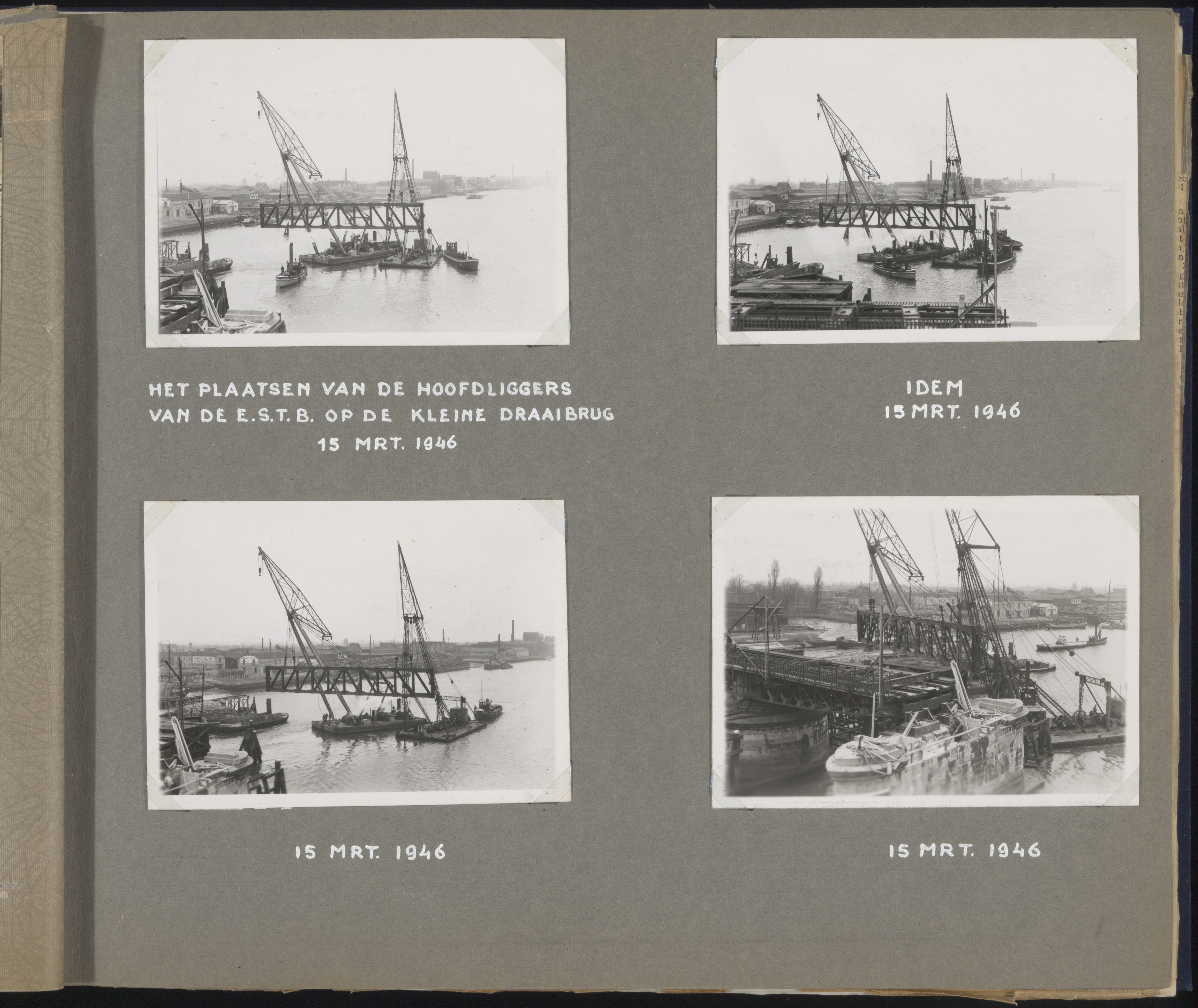 Herstel van de spoorbrug over de Oude Maas tussen Zwijndrecht en Dordrecht aug.1945-Juli 1946 Hier het plaatsen van de hoofdliggers mrt. 1946.