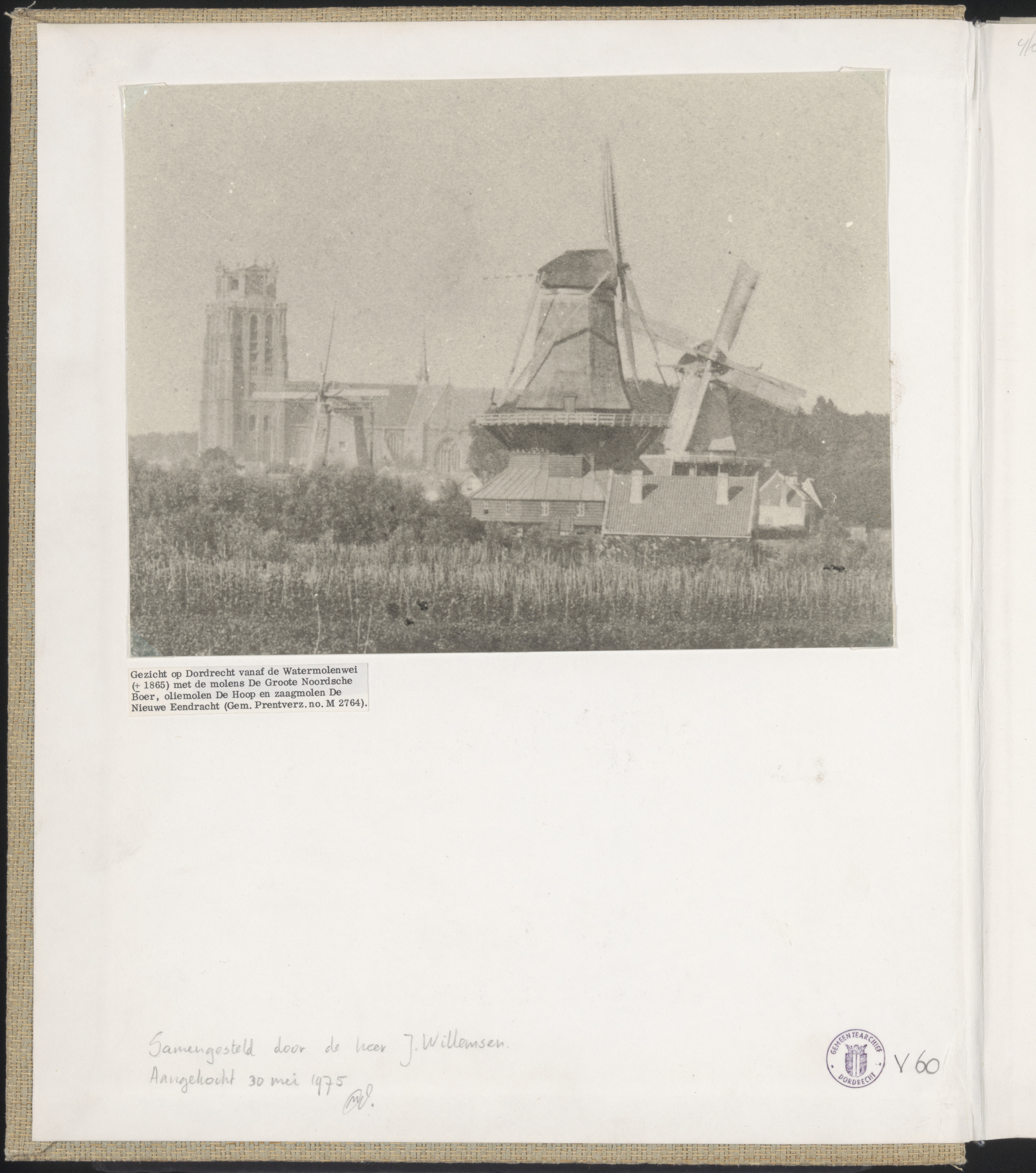- Zicht vanaf de Glazenstraat op de Grote Kerk en molens v.l.n.r. De Zwaan, Het Anker en De (Jonge) Ruiter.
