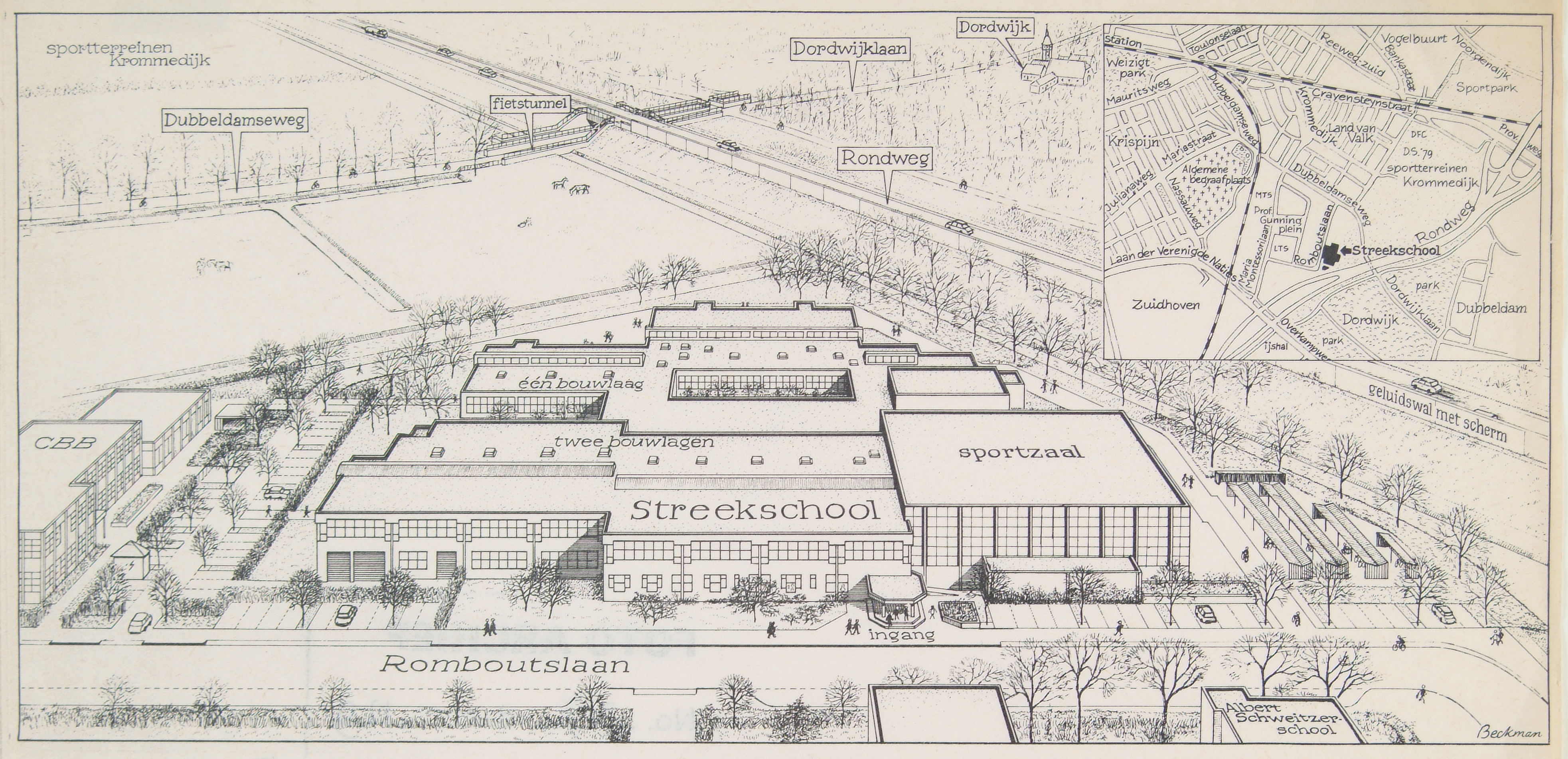 Tekening van de Streekschool aan de Romboutslaan, met plattegrond.