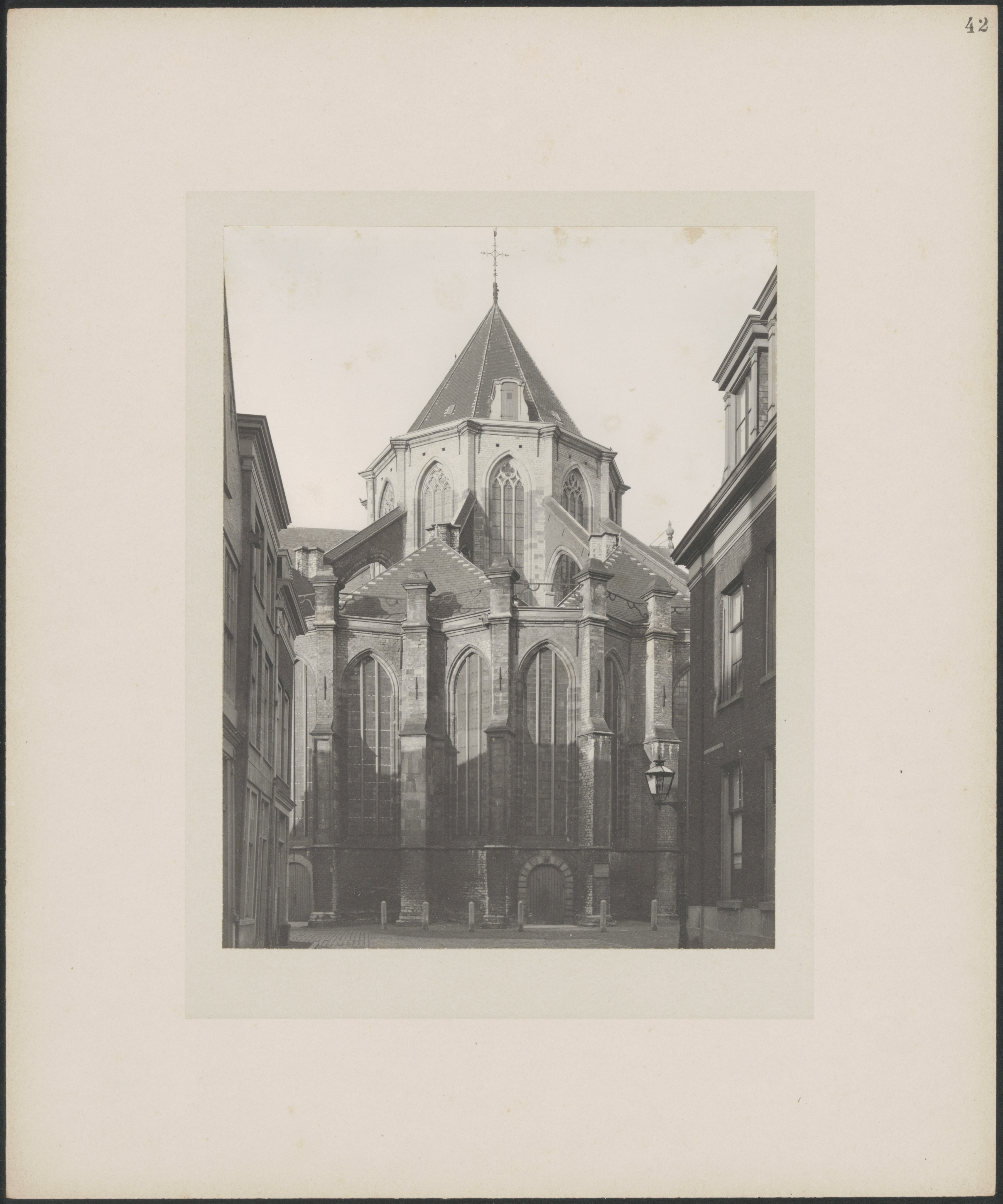 - Buitenaanzicht vanuit de Grotekerksbuurt op het hoogkoor voor een restauratie van de O.L. Vrouwe of Grote Kerk in de jaren 1902-1906