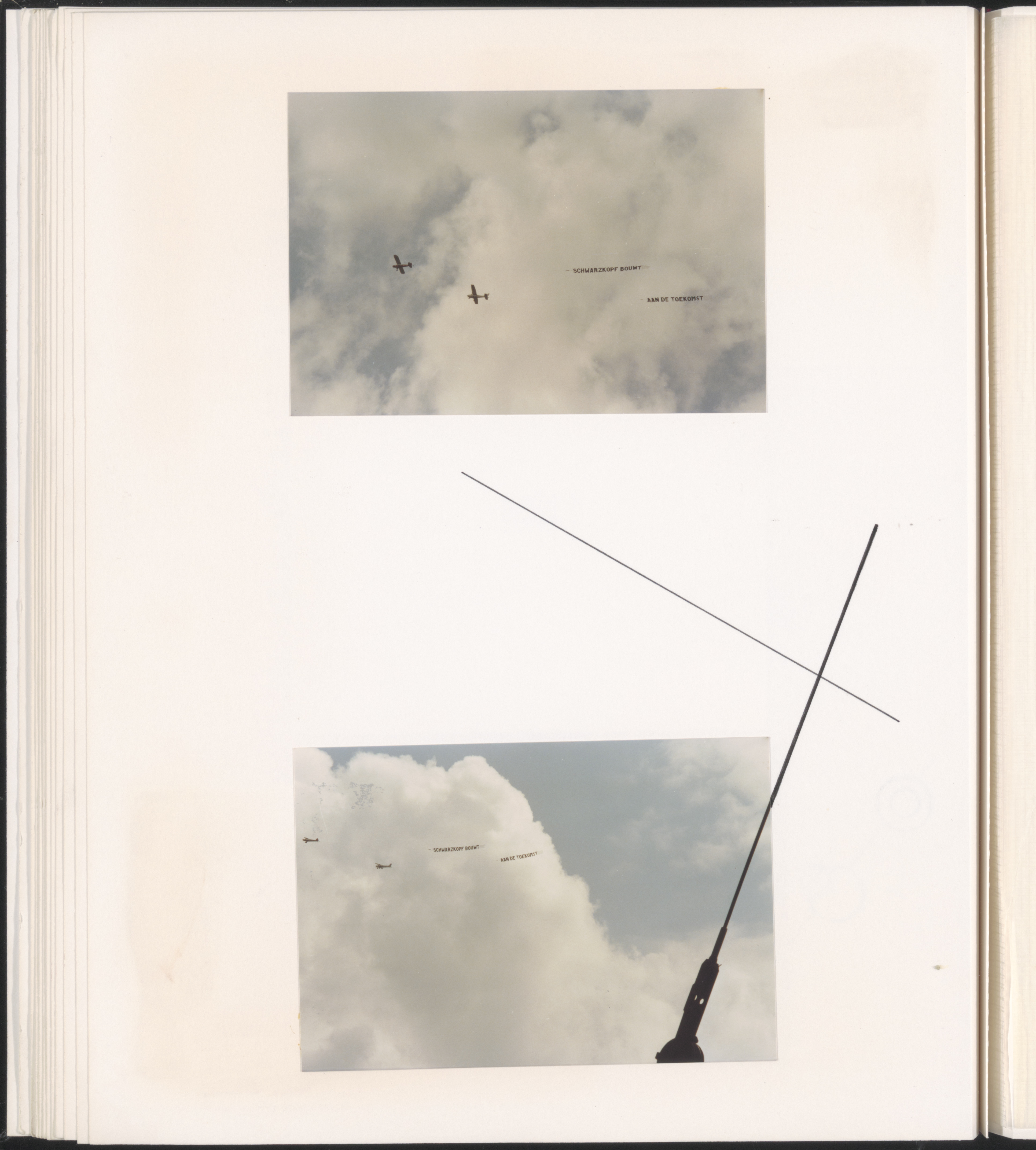 - Luchtreclame bij het slaan van de eerste paal voor uitbreiding van de Swartzkopffabriek aan de Rijksstraatweg.
