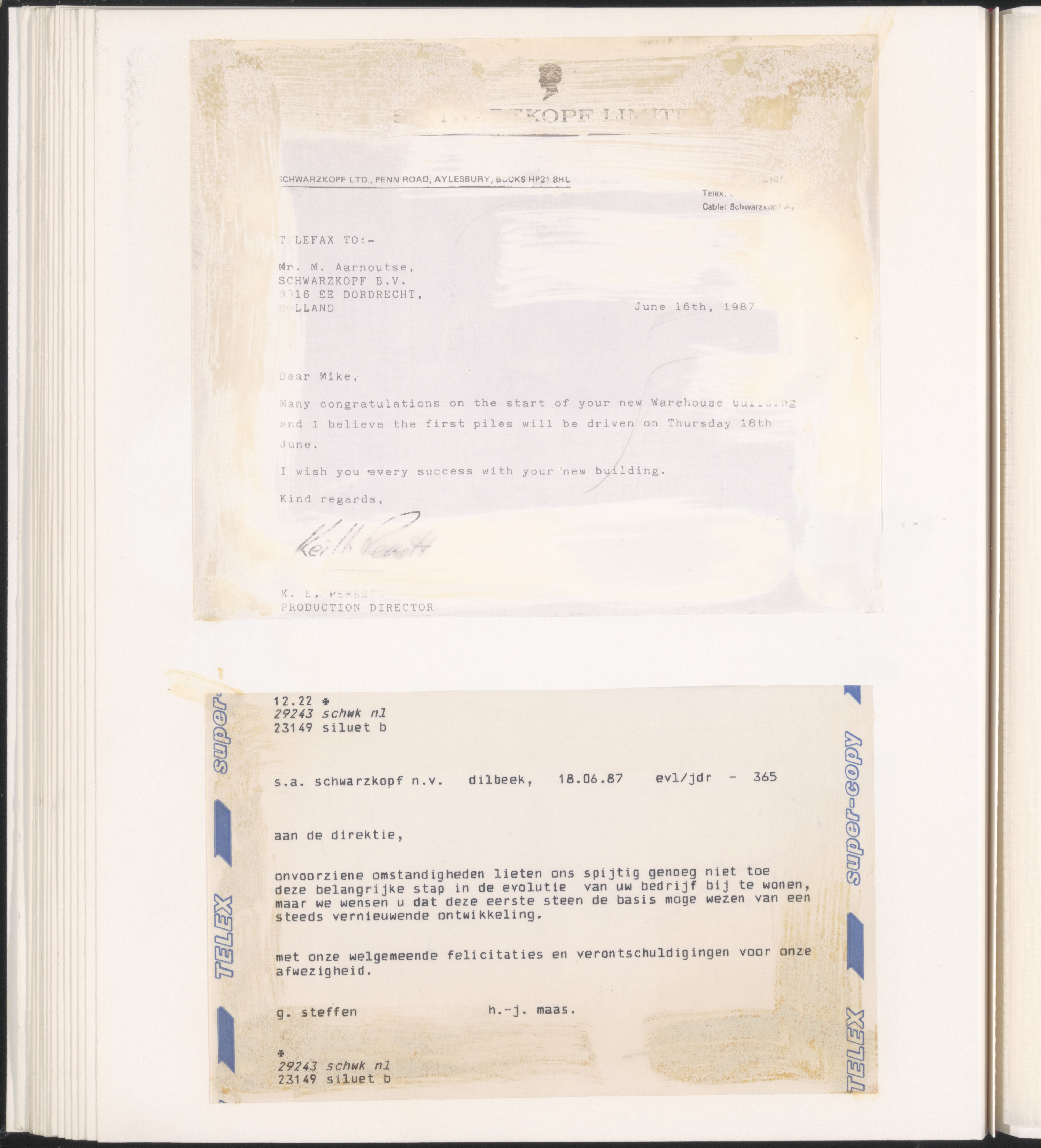 - Felicitaties per telex bij het slaan van de eerste paal voor uitbreiding van de Swartzkopffabriek aan de Rijksstraatweg.