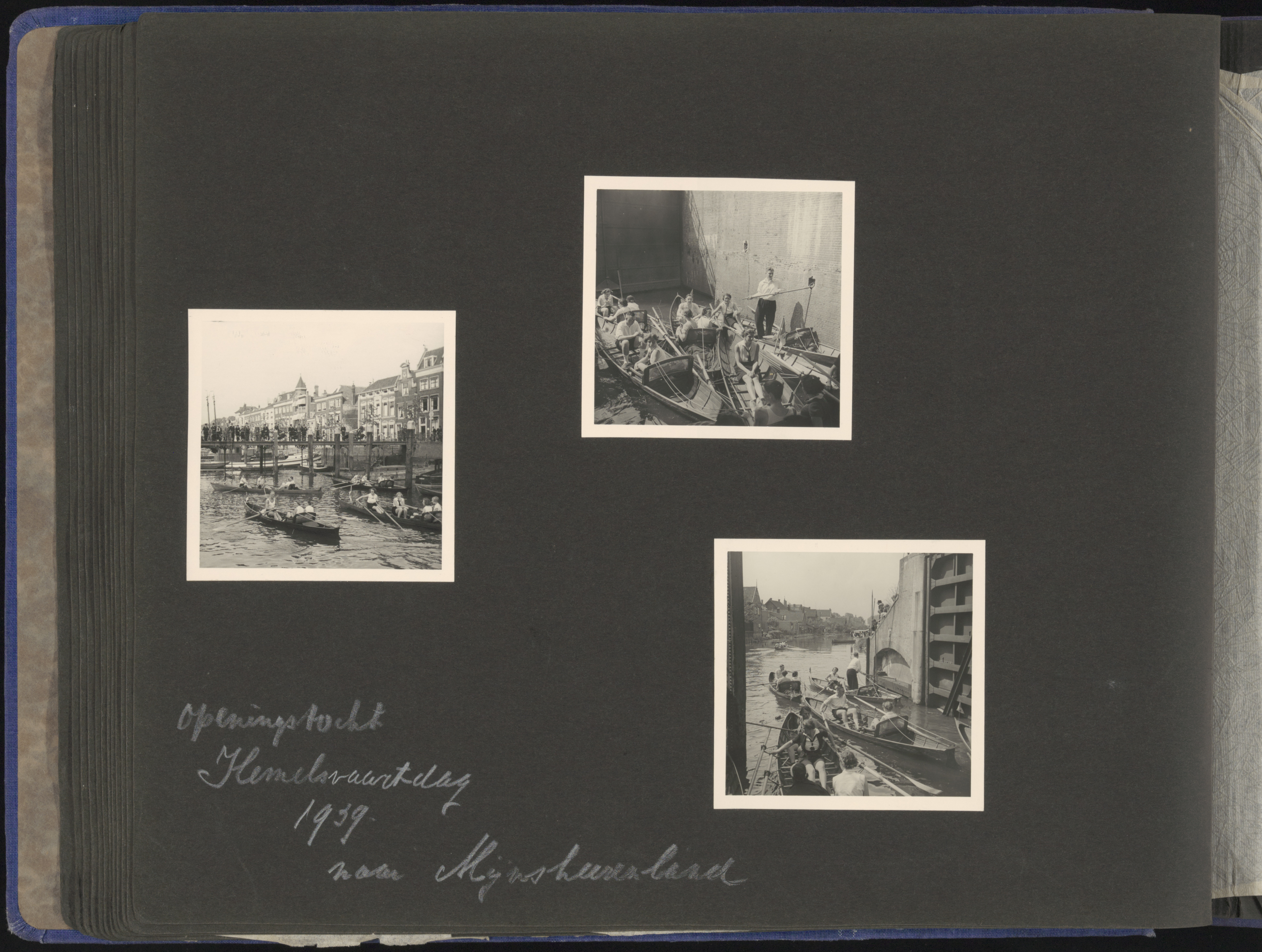- Openingstocht op Hemelvaartsdag van de roei- en zeilvereniging naar Mijnsherenland. Links wherrys in de Nieuwe Haven en recht in de schutsluis in Puttershoek met huizen aan het Schouteneinde.