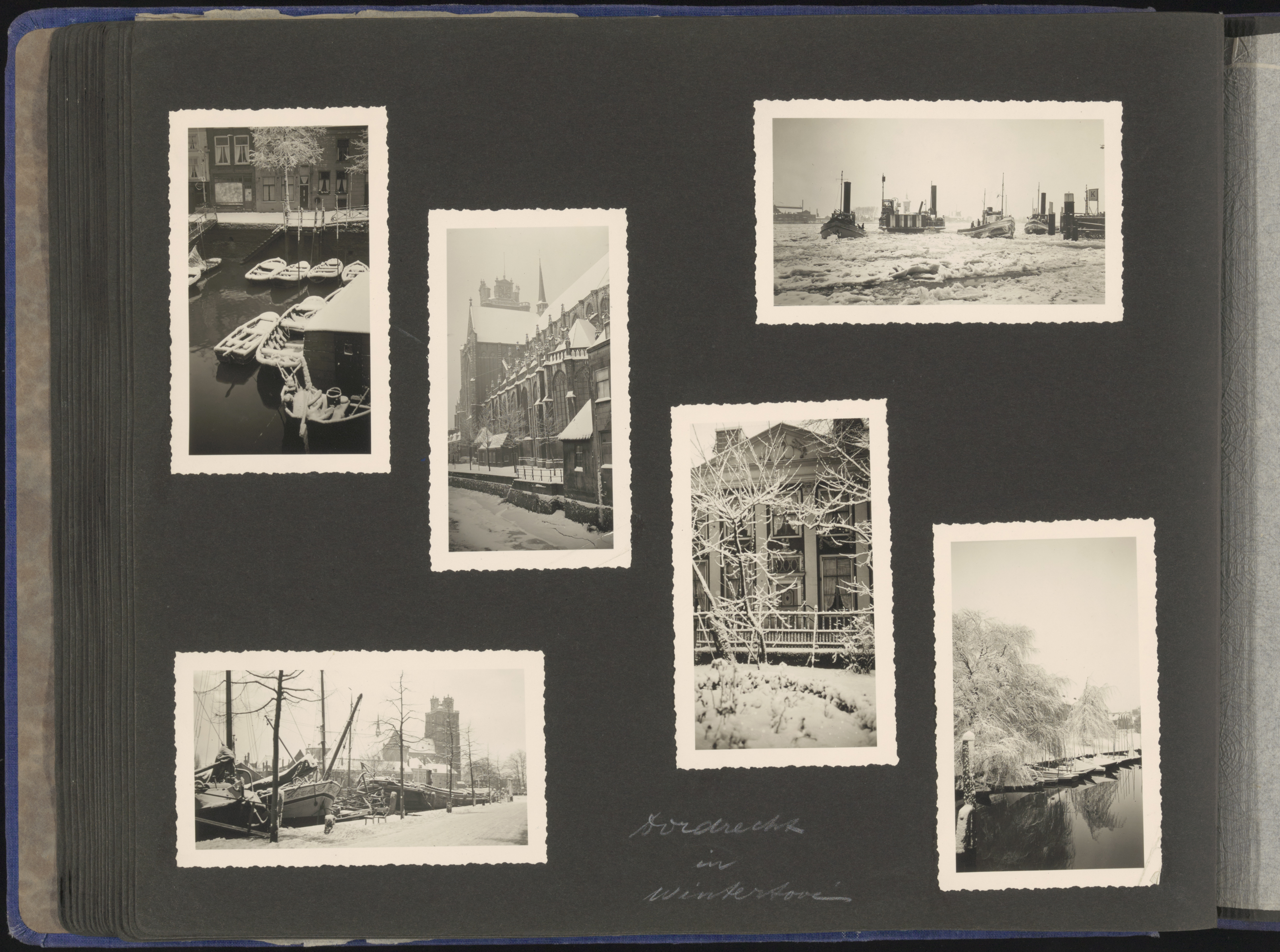 - Linksboven: Roeiboten in de Nieuwe Haven. Huizen staan aan de Knolhaven bij de Lange IJzerenbrug. Rechtsboven: IJsbrekers houden de vaargeul in de Oude Maas open voor de veerdienst op Zwijndrecht. Linksmidden: De Grote Kerk aan de zijde van de Pottenkade en Voorstraatshaven. Rechtsmidden: Huis Beverschaap aan de Korte Engelenburgerkade. Linksonder: Nieuwe Haven richting Grote Kerk. Rechtsonder: Roeiboten in de Spuihaven langs de Vest, gezien vanaf de Spuibrug.