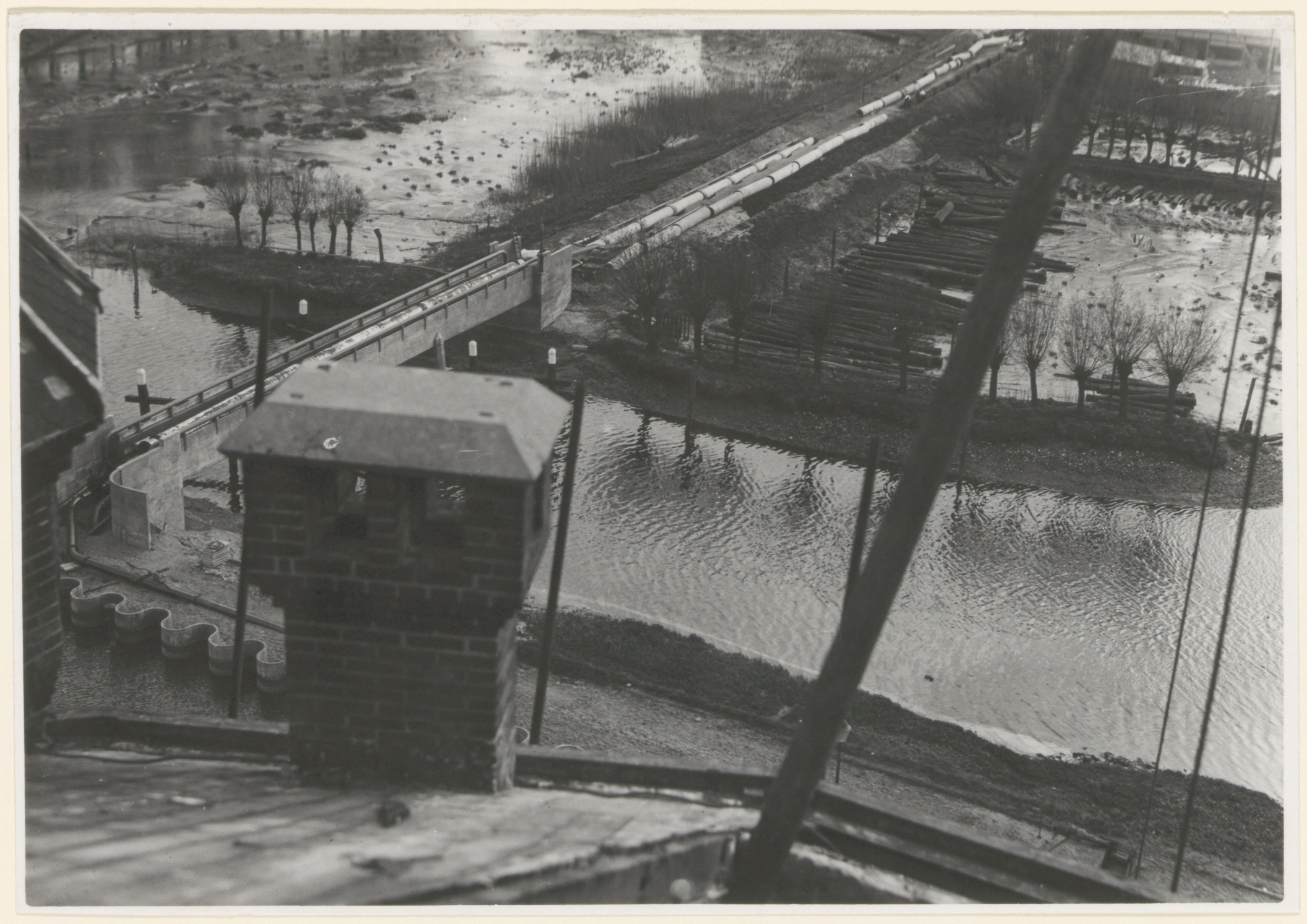 - Betonnen voetbrug over de Vlij op het terrein van de hogedrukwaterleiding, gezien vanaf de watertoren. Rechts een balkengat.