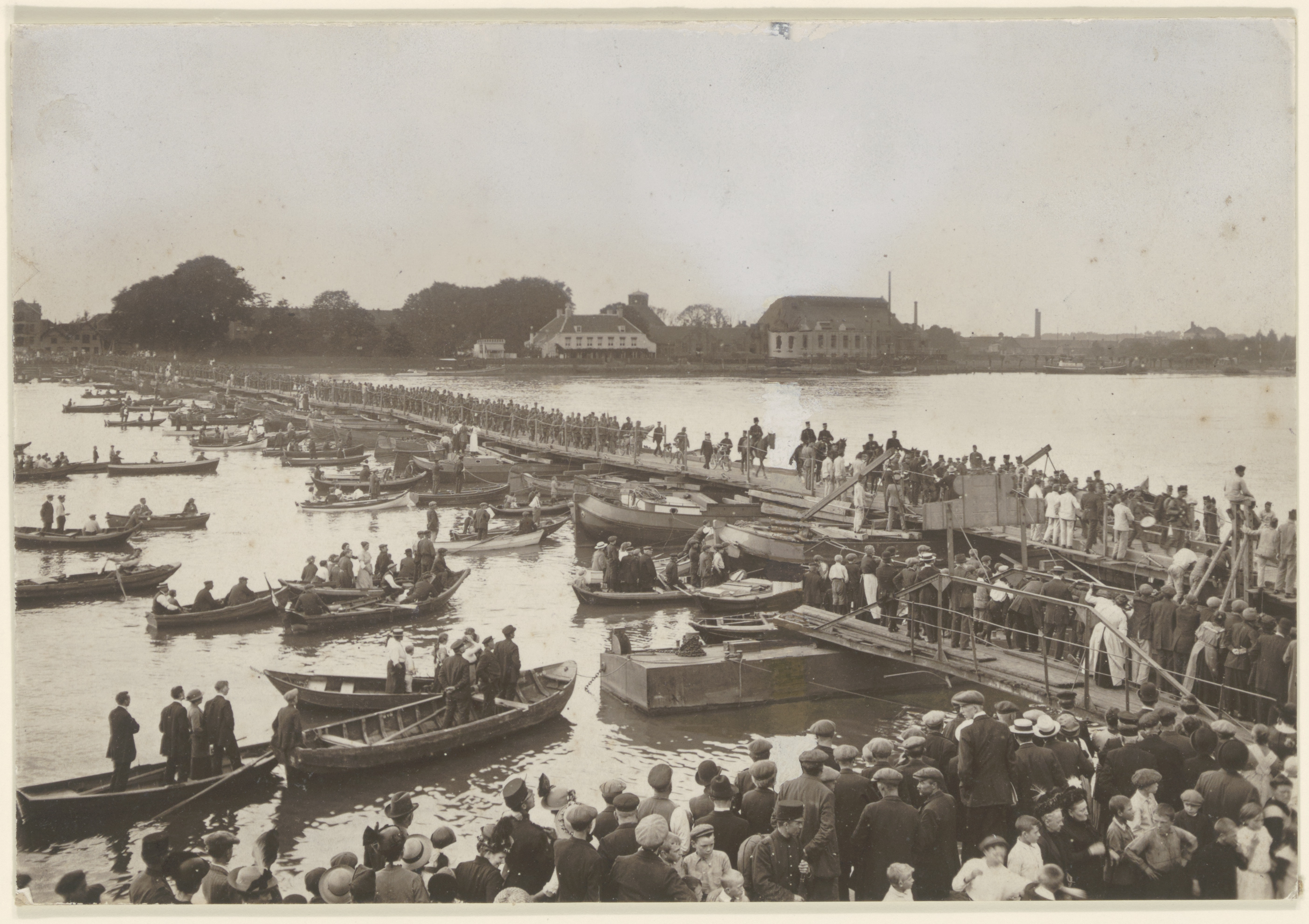 - fabrieken militairen / soldaten pontonbruggen publiek / toeschouwers roeiboten