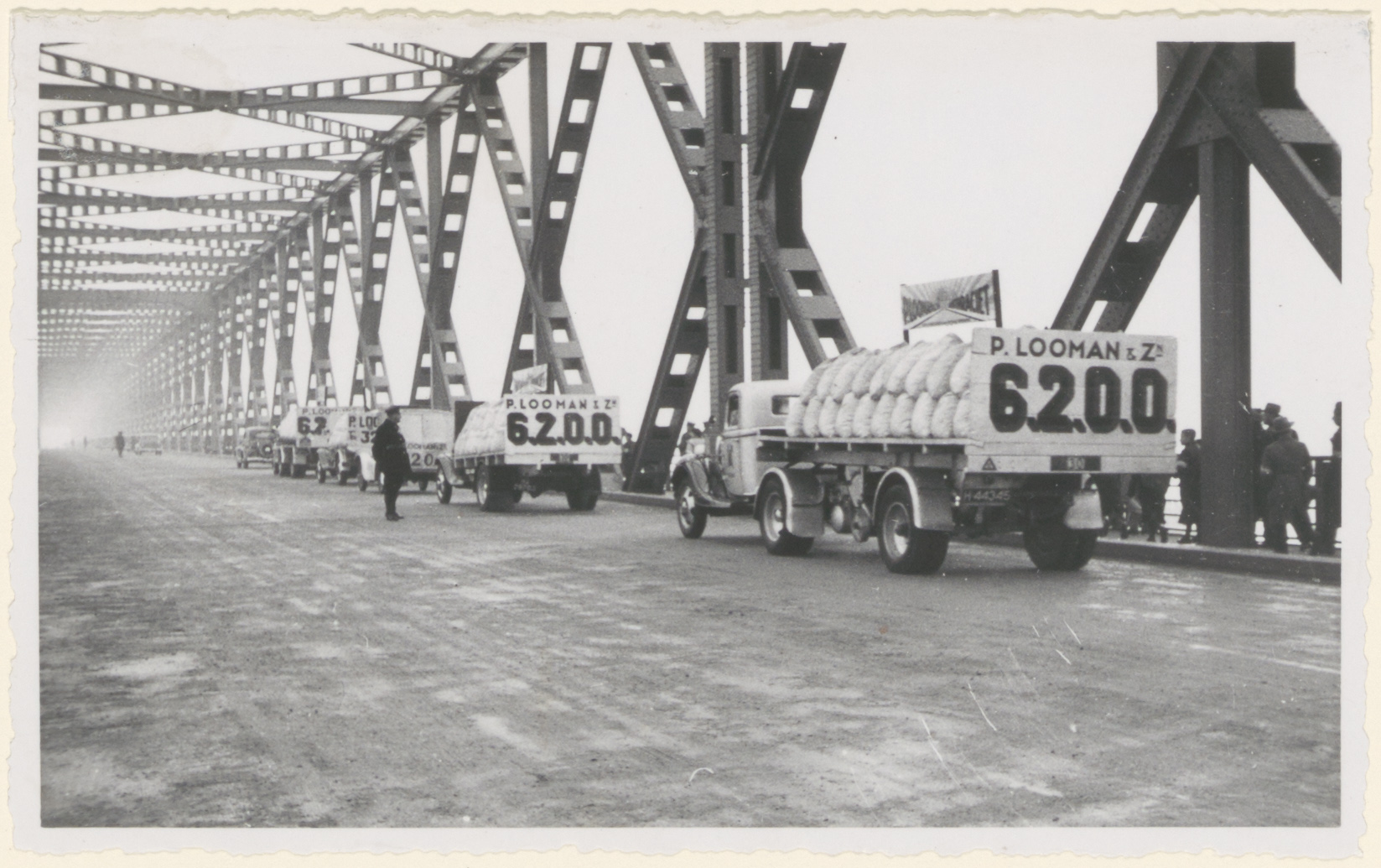 Vrachtauto's even ingebruikneming van de verkeersbrug over het Hollandsch Diep.