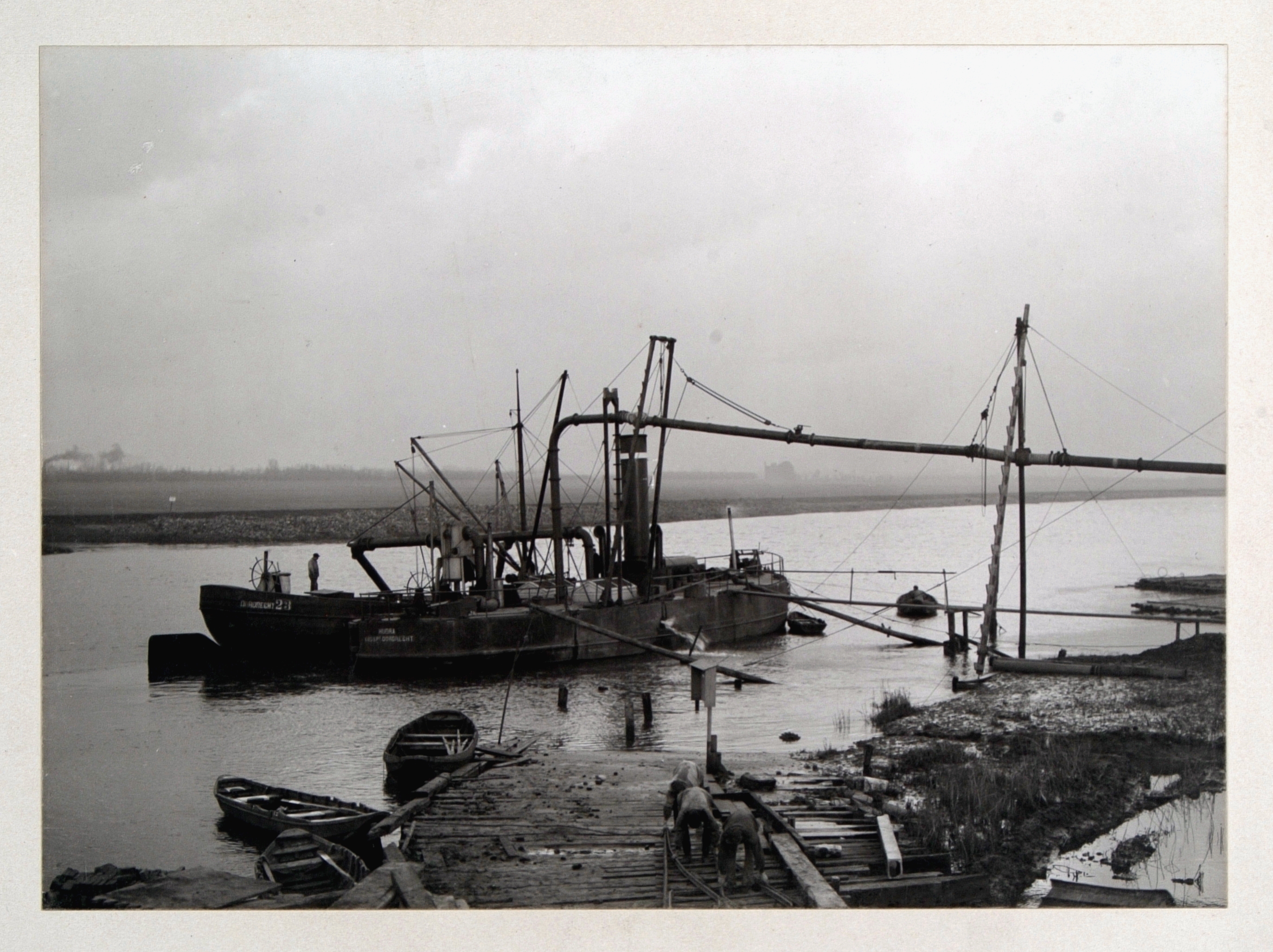 Zandzuiger van fa. Bos Pzn. te Dordrecht spuit zand op voor 1200 m. verderop gelegen …