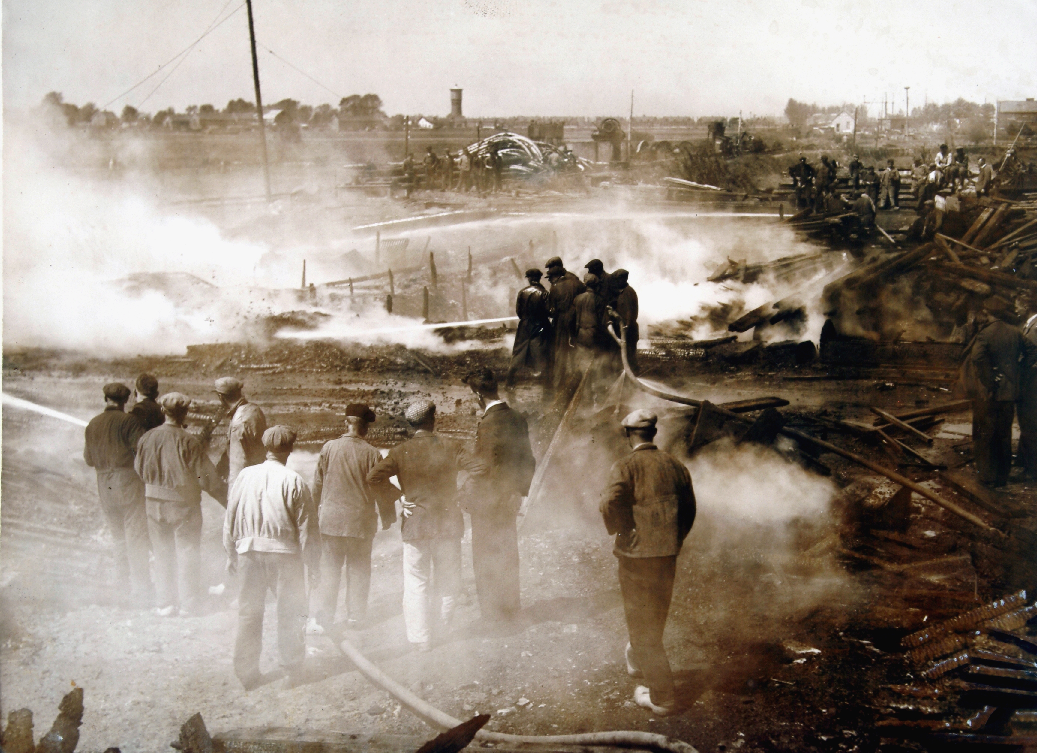 - Een grote houtstapel verbrandt aan de Rijsdijk in Krimpen aan de Lek. Midden op de achtergrond de watertoren in Hendrik Ido Ambacht.