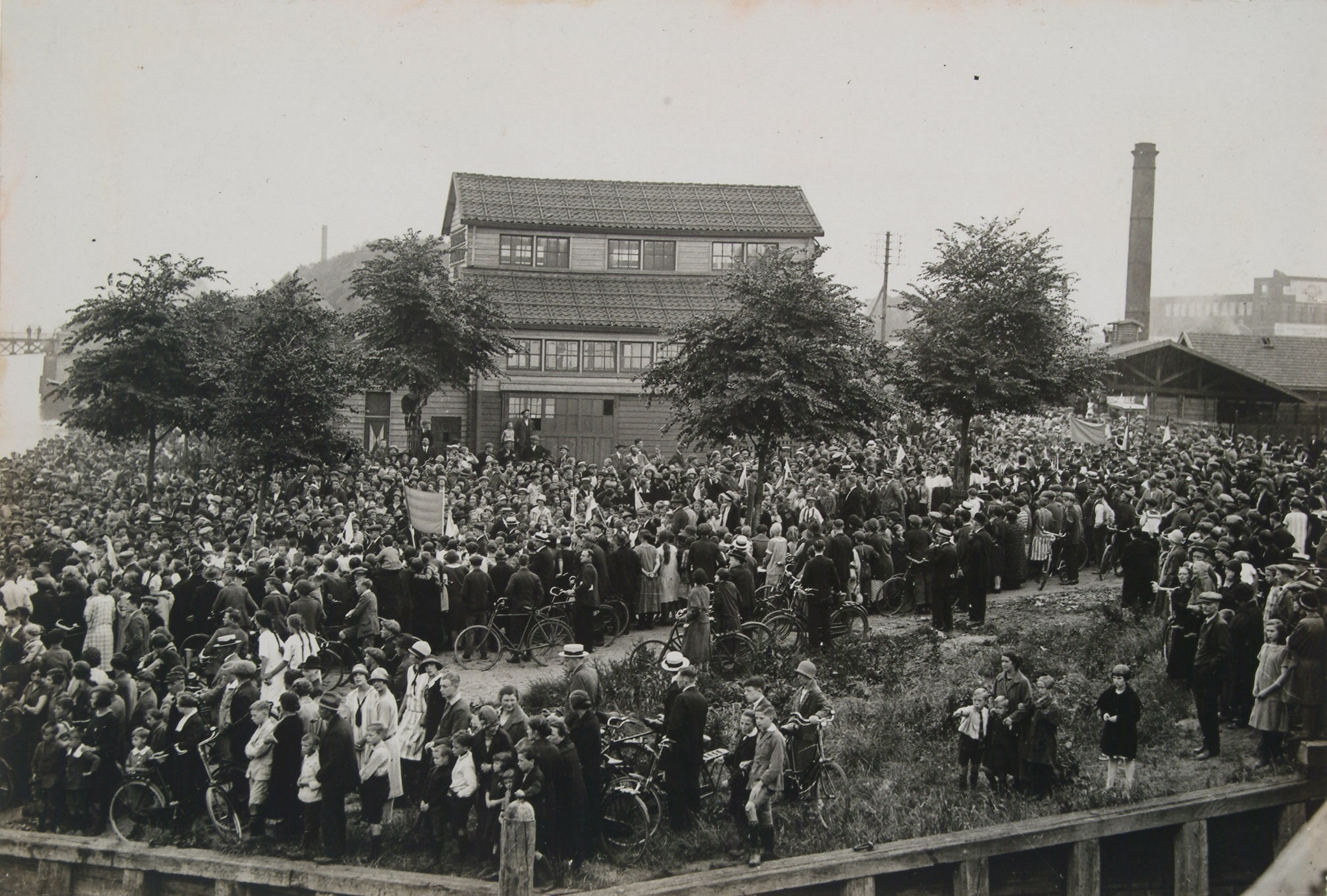 - Vertrek of aankomst van een boot van rederij Op de Lek met kinderen voor een uitje georganiseerd door de Vereniging Vakantiekinderfeesten bij het gebouw van de groenteveiling aan de 's-Gravendeelsedijk