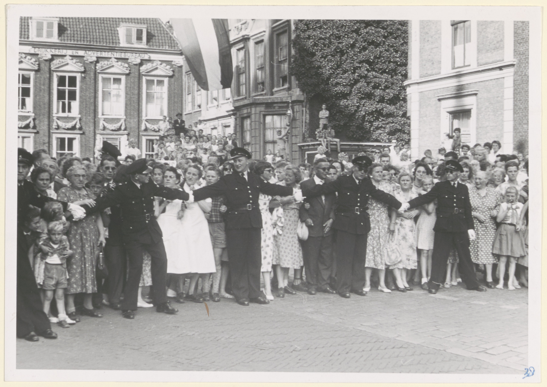 Publiek op het Grotekerksplein tijdens een bezoek van Hare Majesteit Koningin Juliana voor de opening van de Julianahaven.