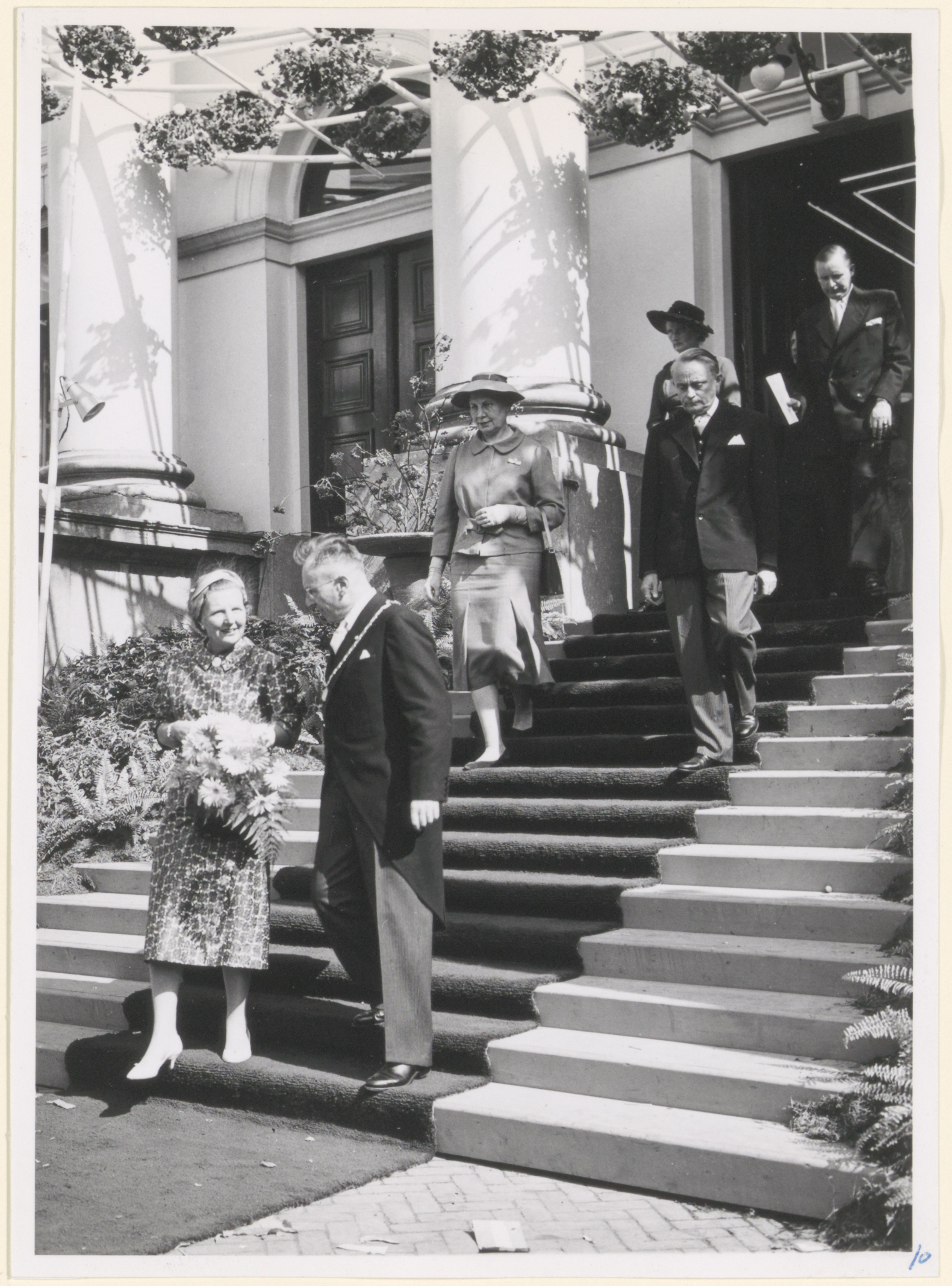- Hare Majesteit Koningin Juliana - in gezelschap van burgemeester Van der Dussen - verlaat het stadhuis tijdens haar bezoek bij de opening van de Julianahaven.