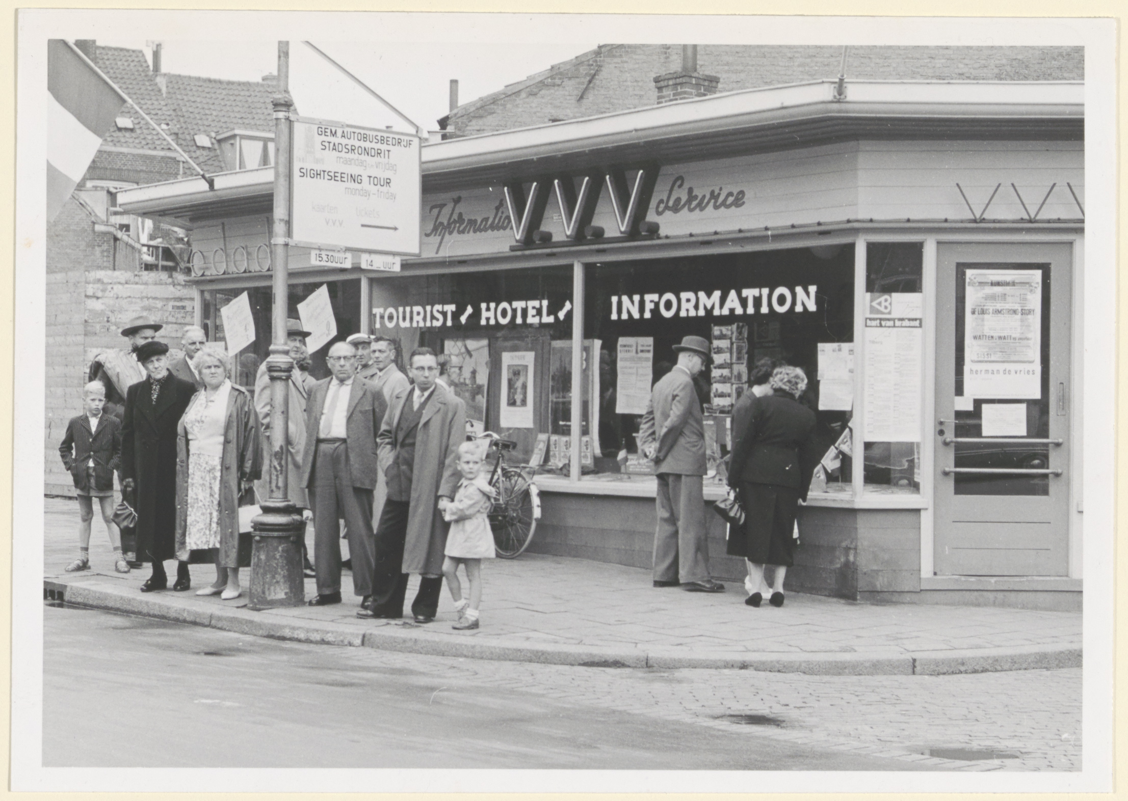 Deelnemers aan een stadsrondrit bij de VVV-kiosk in de Johan de Wittstraat op de hoek …