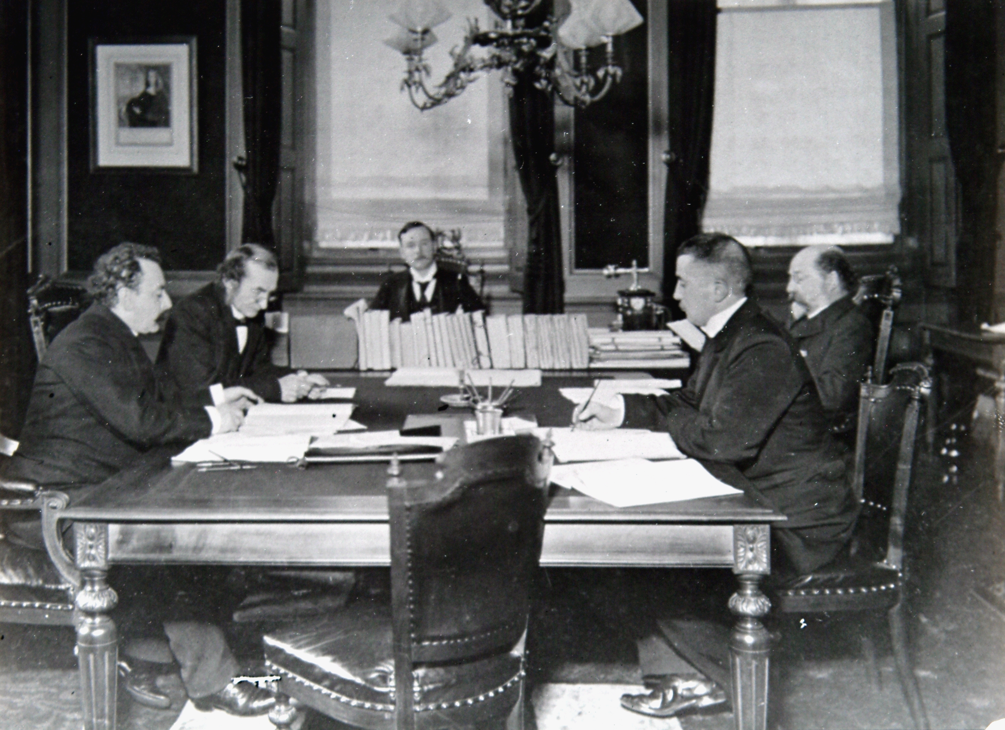 De voltallige gemeenteraad onder voorzitterschap van burgemeester Zimmerman (midden), die secretaris was van 1896-1899 en burgemeester van 1899-1906. De andere heren zijn De Bosson, Hordijk, een onbekende en secretaris Van Houten.