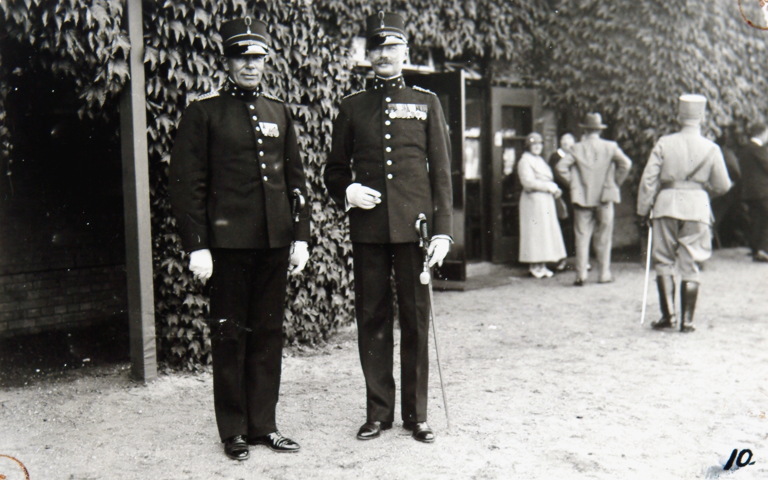 - Twee officieren van de bijzondere Vrijwillige Landstorm tijdens een landdag in het sportpark. Rechts is kapitein Reimers; later werd hij bevorderd tot majoor.