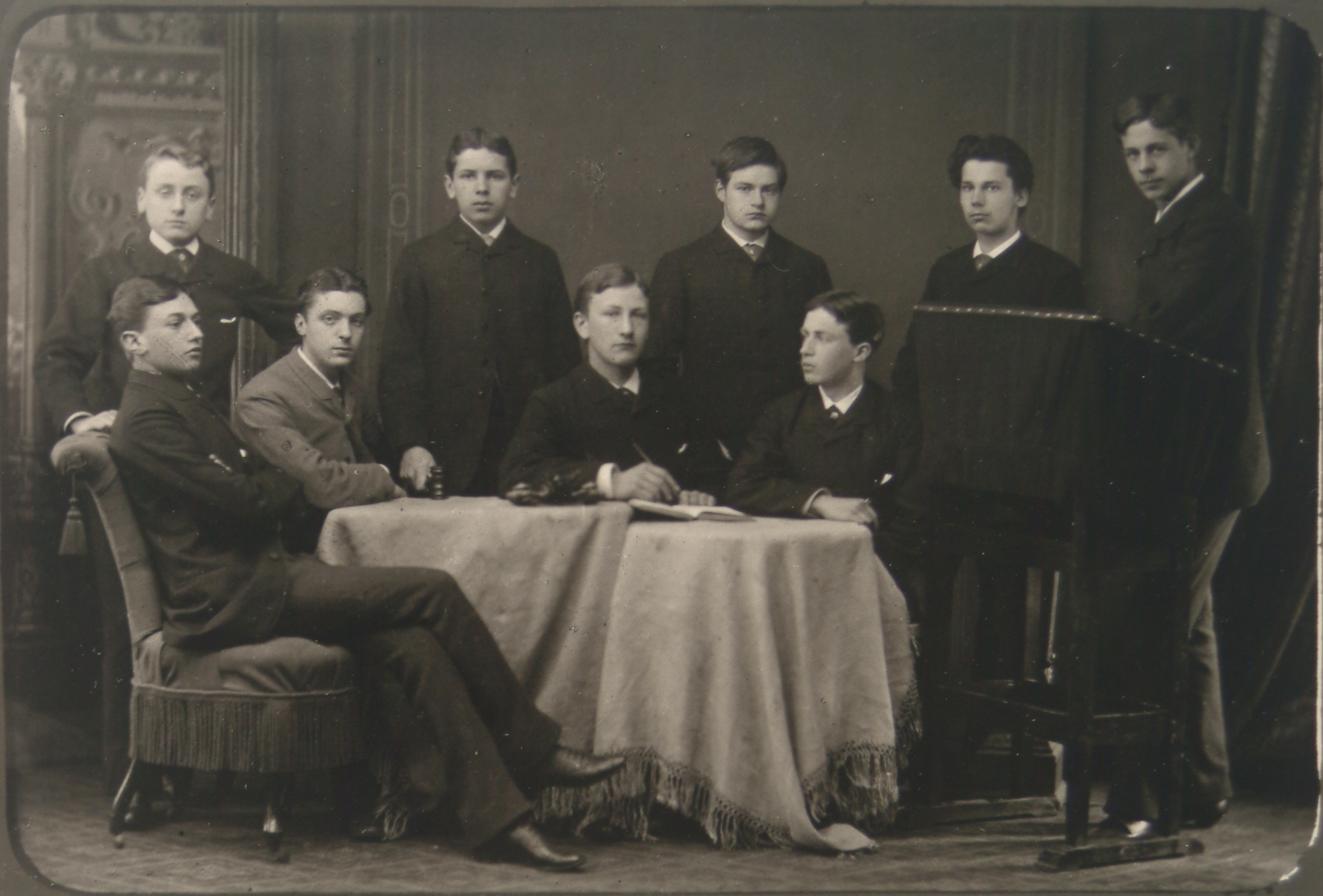 - Groepsportret De Vriendenkring H.B.S. Staande v.l.n.r. Wouter Van Oldenborgh, Hein van der Ven, Willem de Koning, Frans Roeff, Piet de Kanter. Zittend George Heeleij, Everard H. Lebret, Jacob C. Stoop en Rego(rius) Veth.