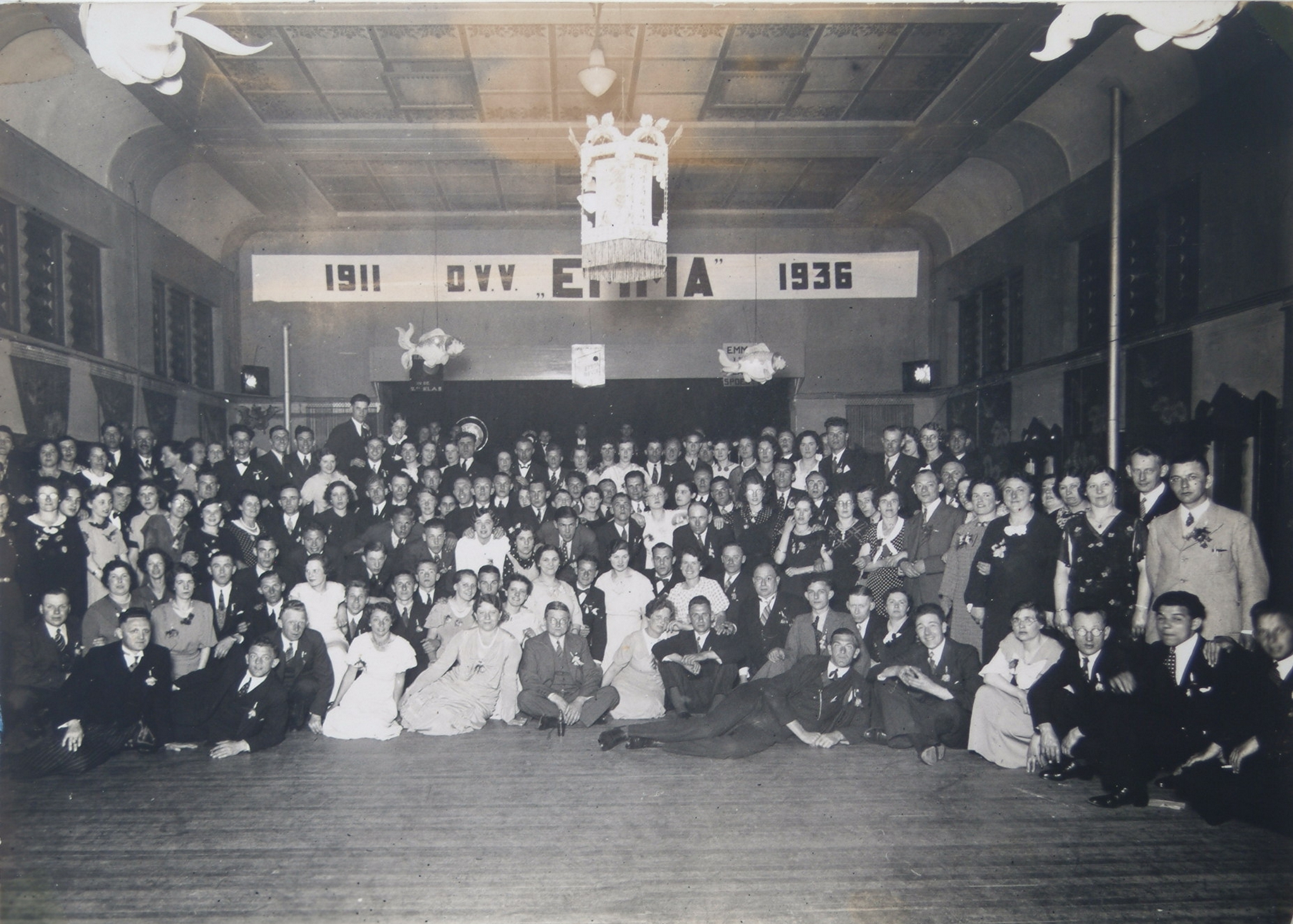- Groepsfoto van leden van voetbalvereniging Emma t.g.v. de viering van het 25-jarig bestaan in zaal Heibeek op de Burgemeester de Raadtsingel