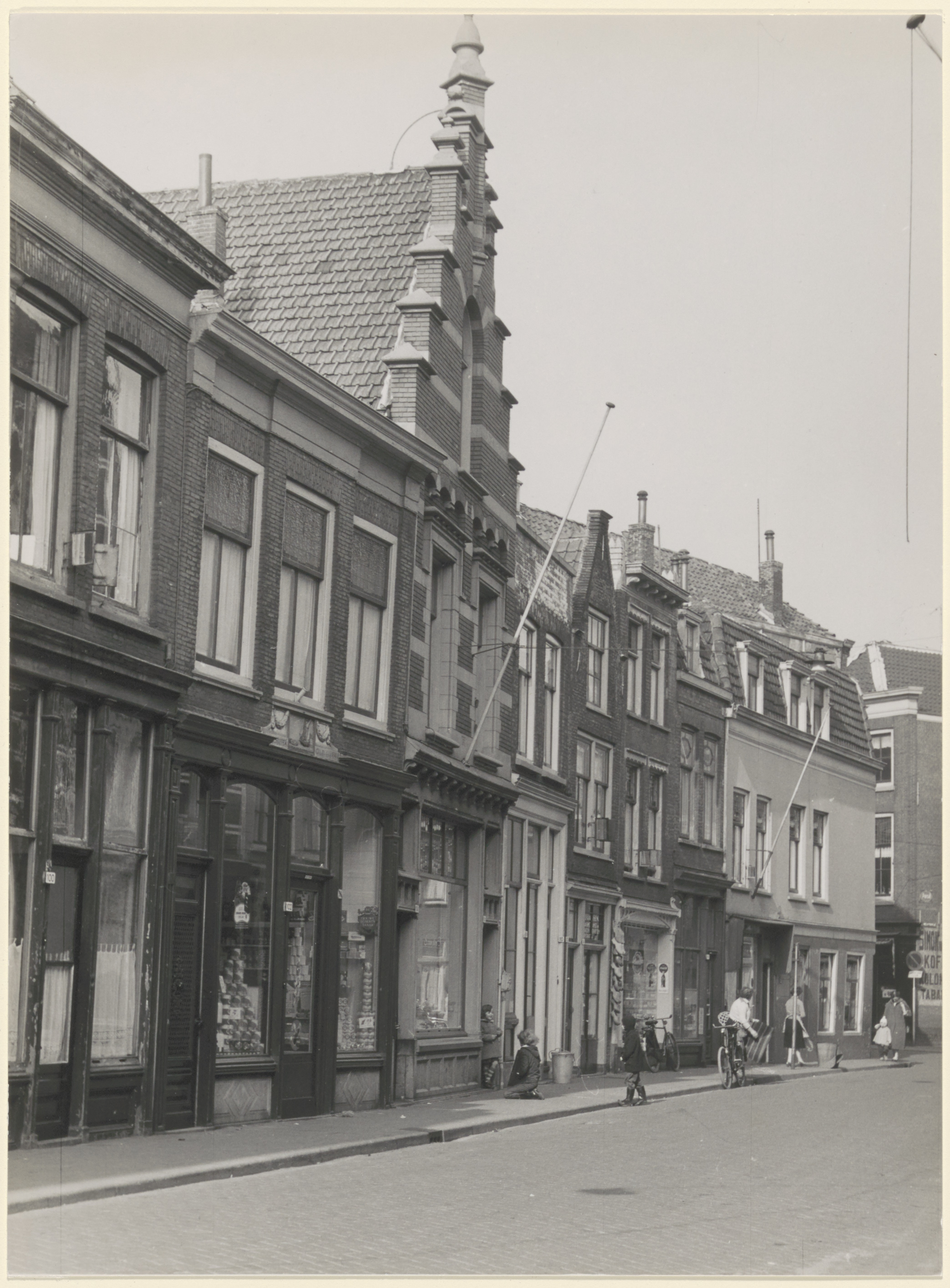 - boogramen gevelstenen kinderen trapgevels voetgangers vuilnisemmers winkels