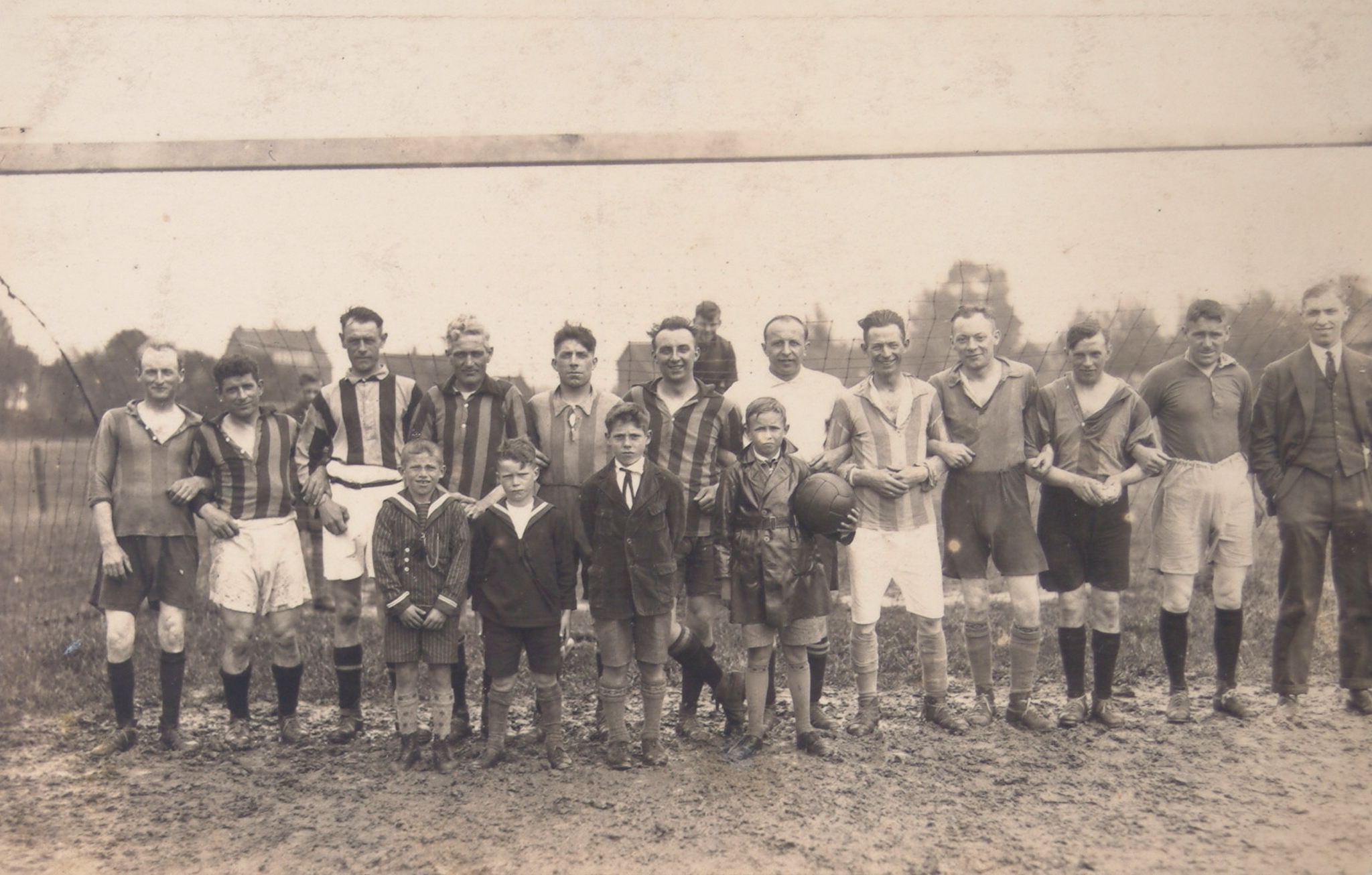 Groepsportret van een elftal en supporters van voetbalvereniging Emma
